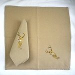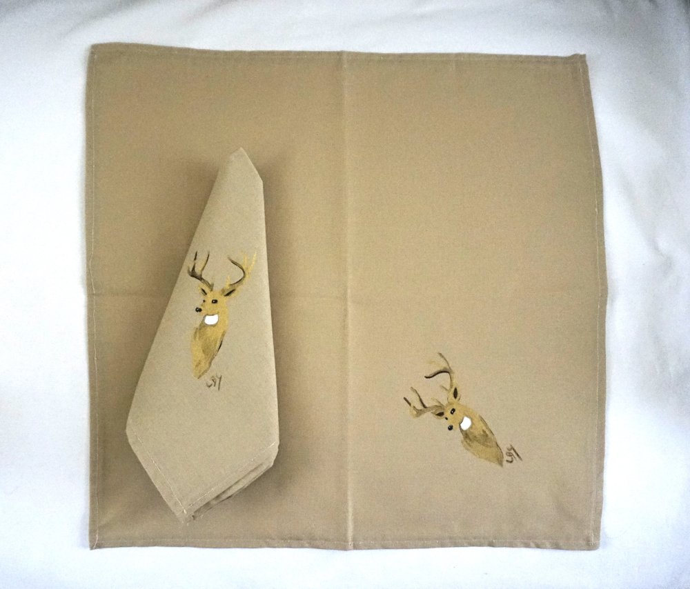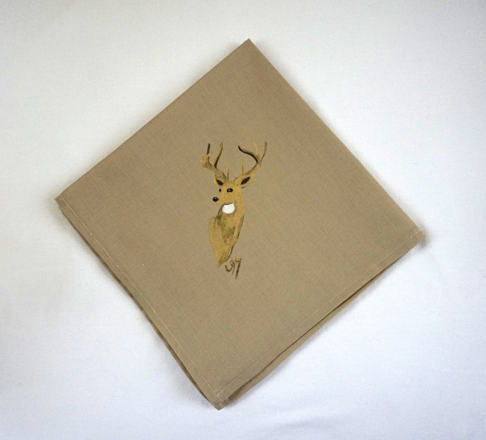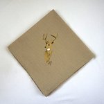 serviette de table en coton de couleur beige avec comme motif une tête de cerf dorée, peinte à la main. La peinture est fixée au fer chaud et ne bouge pas.
