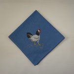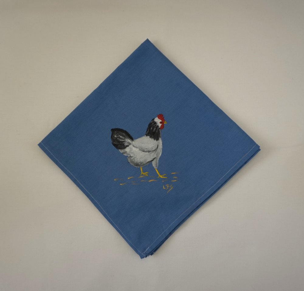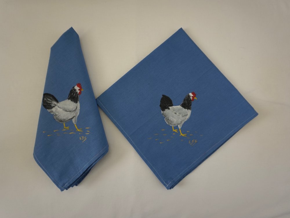 serviette de table en coton bleu clair avec comme motif une poule blanche et noir peinte à la main. La peinture est fixée au fer chaud et ne bouge pas.