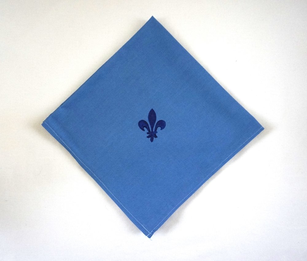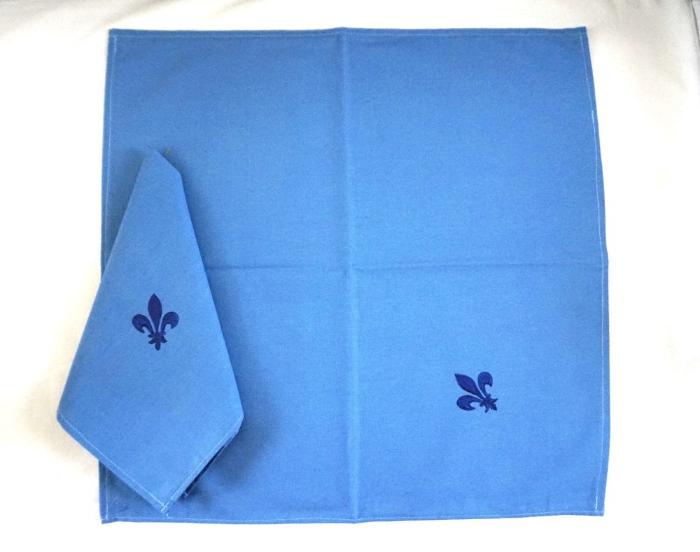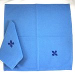serviette de table en coton bleu clair avec comme motif une fleur de lys bleuepeinte à la main. La peinture est fixée au fer chaud et ne bouge pas.