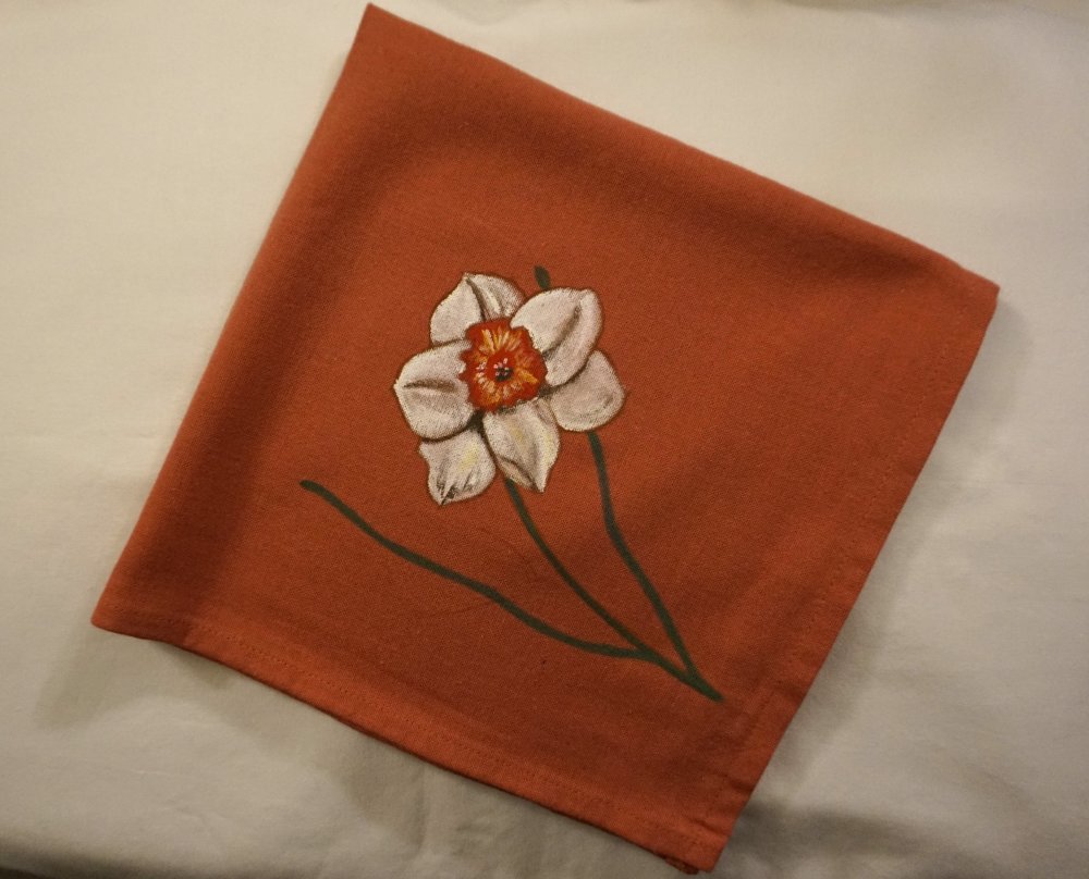 serviette de table en coton rouge brique avec comme motif un narcisse des poètes blanc, peint à la main. La peinture est fixée au fer chaud et ne bouge pas.