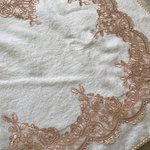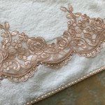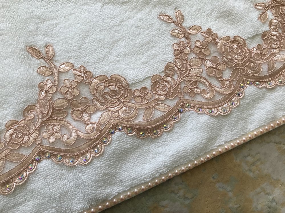 Tapis de bain blanc avec une belle dentelle rose cousu aux alentour des perles et des strass en cristal sur la dentelle