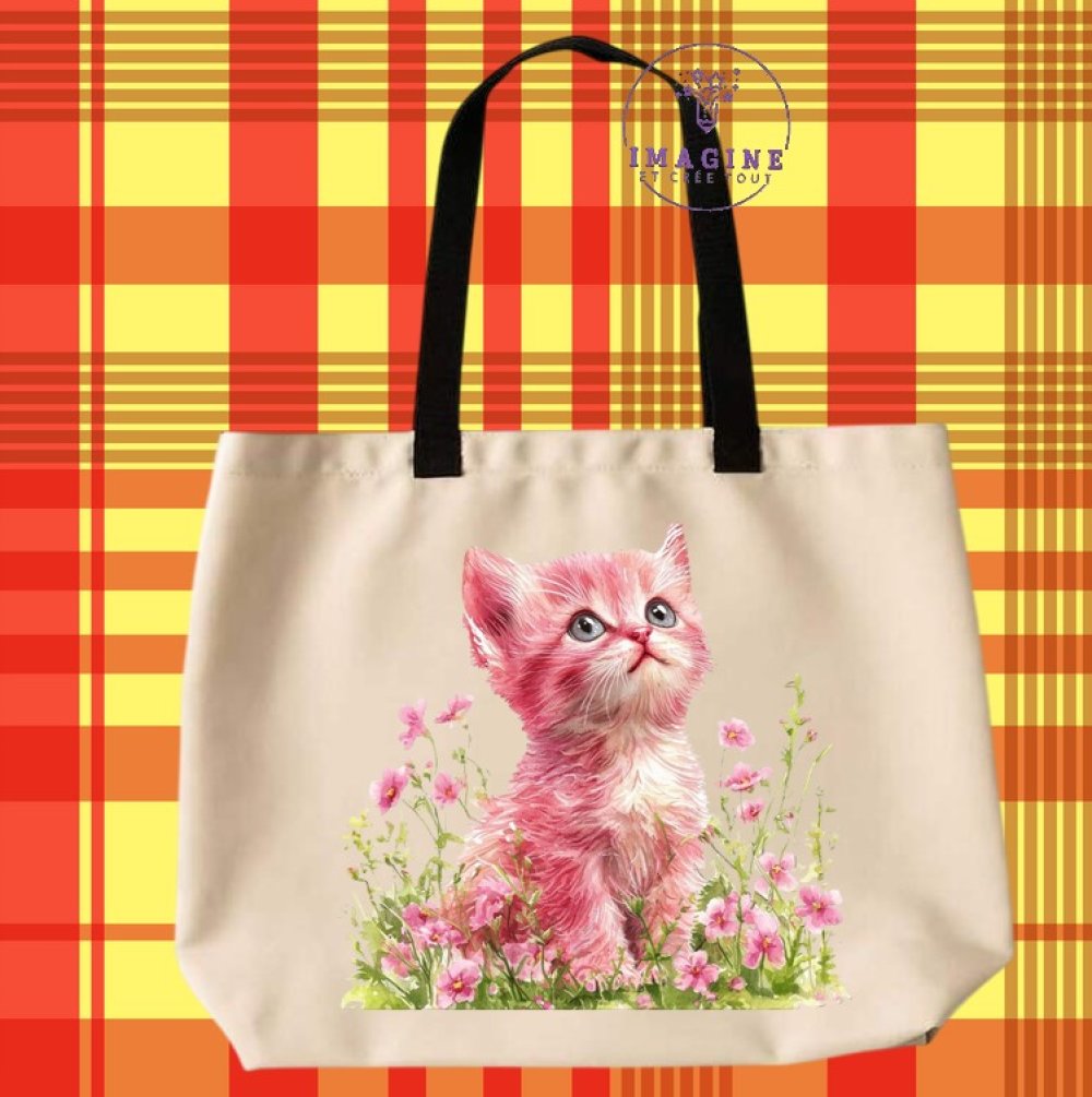 Tote bag taille L - sublimation - châton rose - fleurs - couleurs - animal - prairie - chat - jardin fleuri