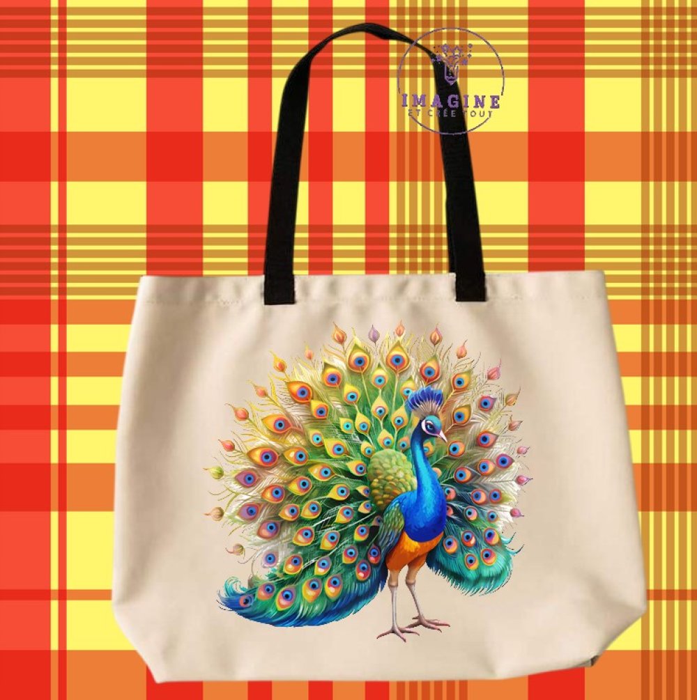 Tote bag taille L - sublimation - impression infusible ink - Majestic paon - magnificent peaocock - plumes multicolores