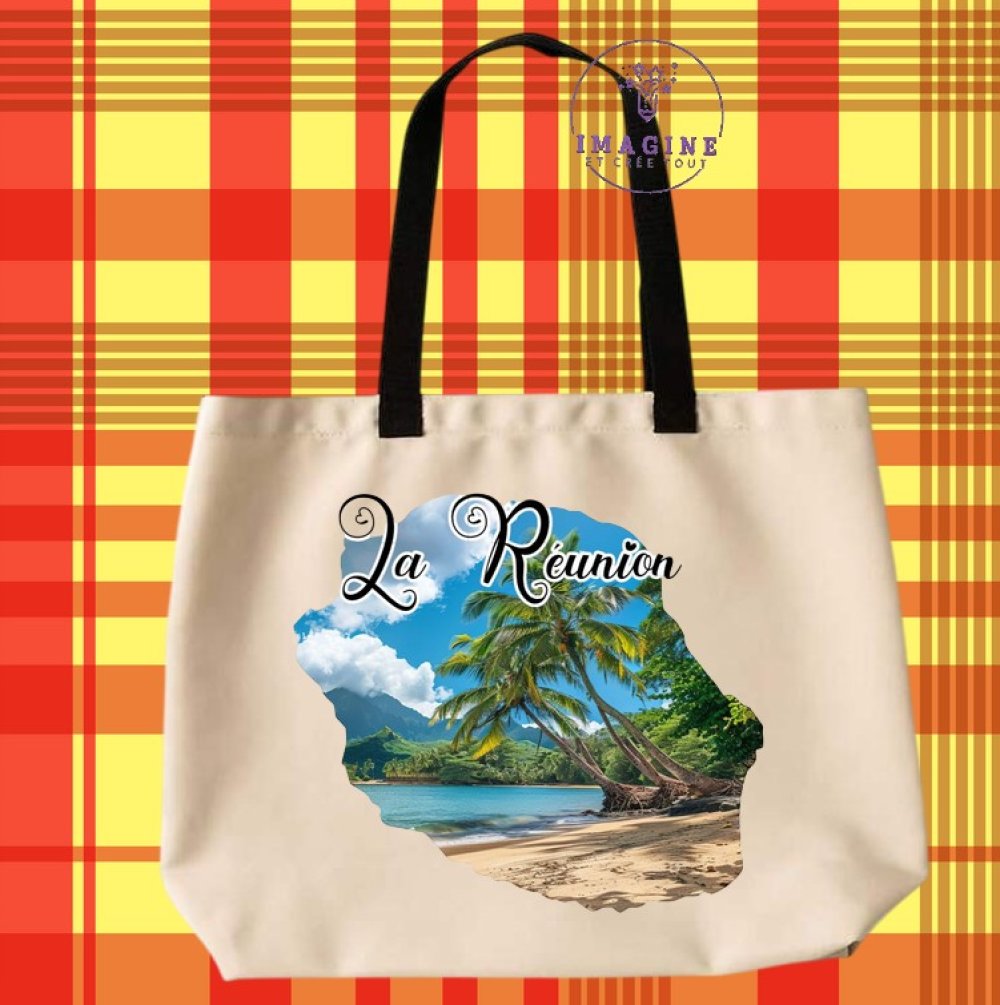 Tote bag taille L - sublimation - impression infusible ink - carte île de la réunion - plage - 974 - palmiers