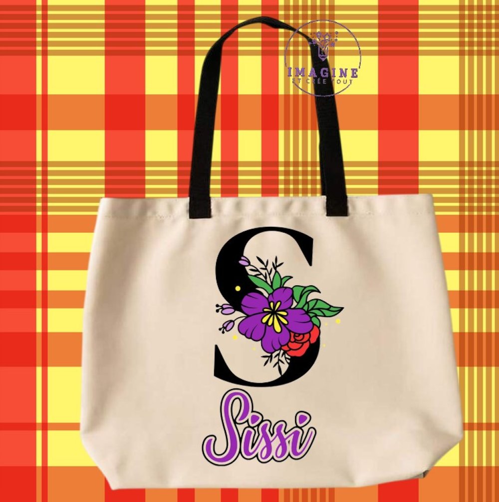 Tote bag taille L - sublimation - initiale - prénom - fleurs - surnom - fille - multicolores - (prénom à preciser)