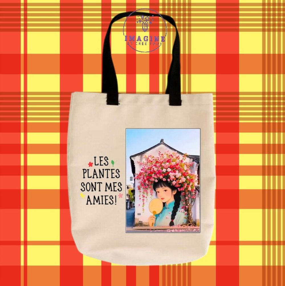 Tote bag taille M - sublimation - tête fleurie - fleurs - rosiers - plantes - silhouette - déco - mur - phrase - femme