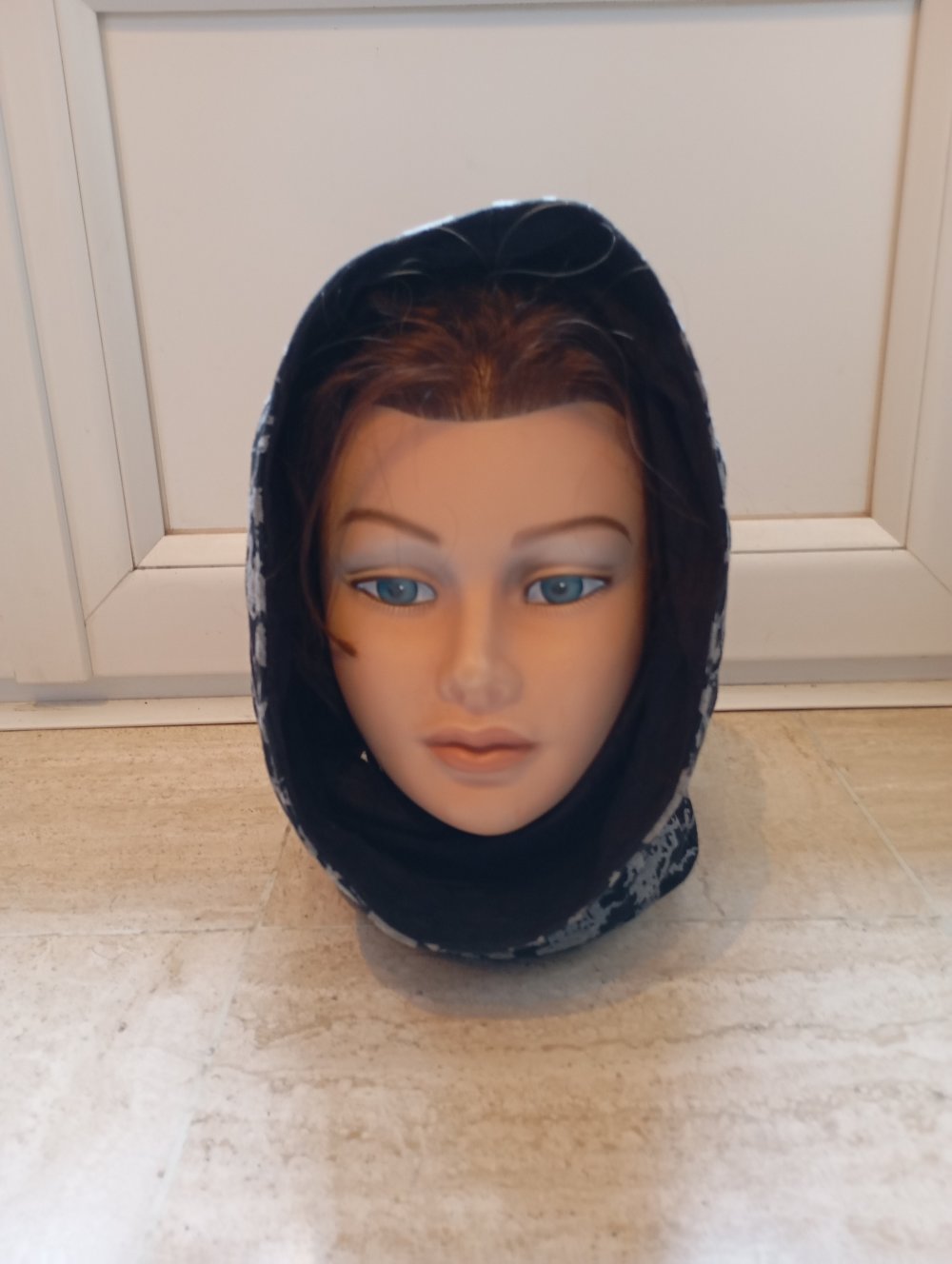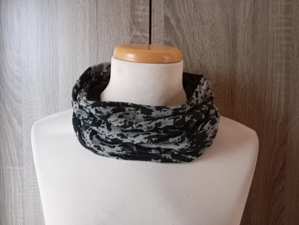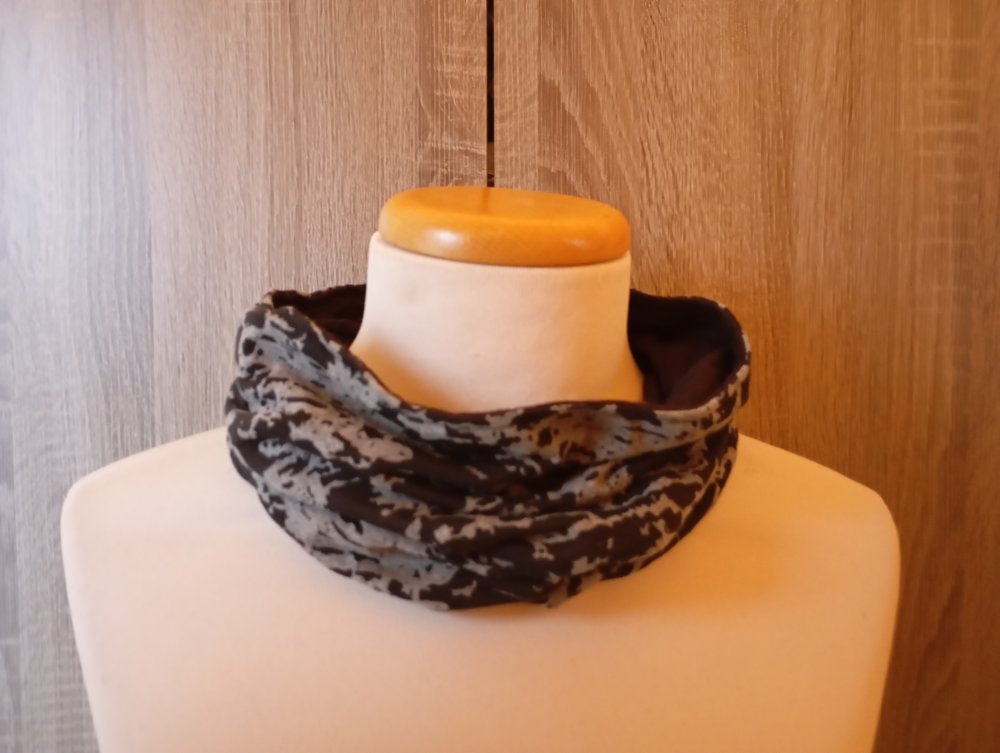 Snood ,tour de cou femme Fait main ,pour un tour de tête de 64cm maximum, d'une hauteur de 37cm suffisamment haut pour le ramener sur la tête, réversible un côté à motif et l'autre côté uni dans un tissu daim doux froissé