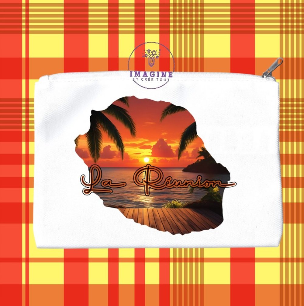 Trousse M - maquillage - sublimation - carte île de la réunion - couché soleil - 974 - paille en queue - personnalisation