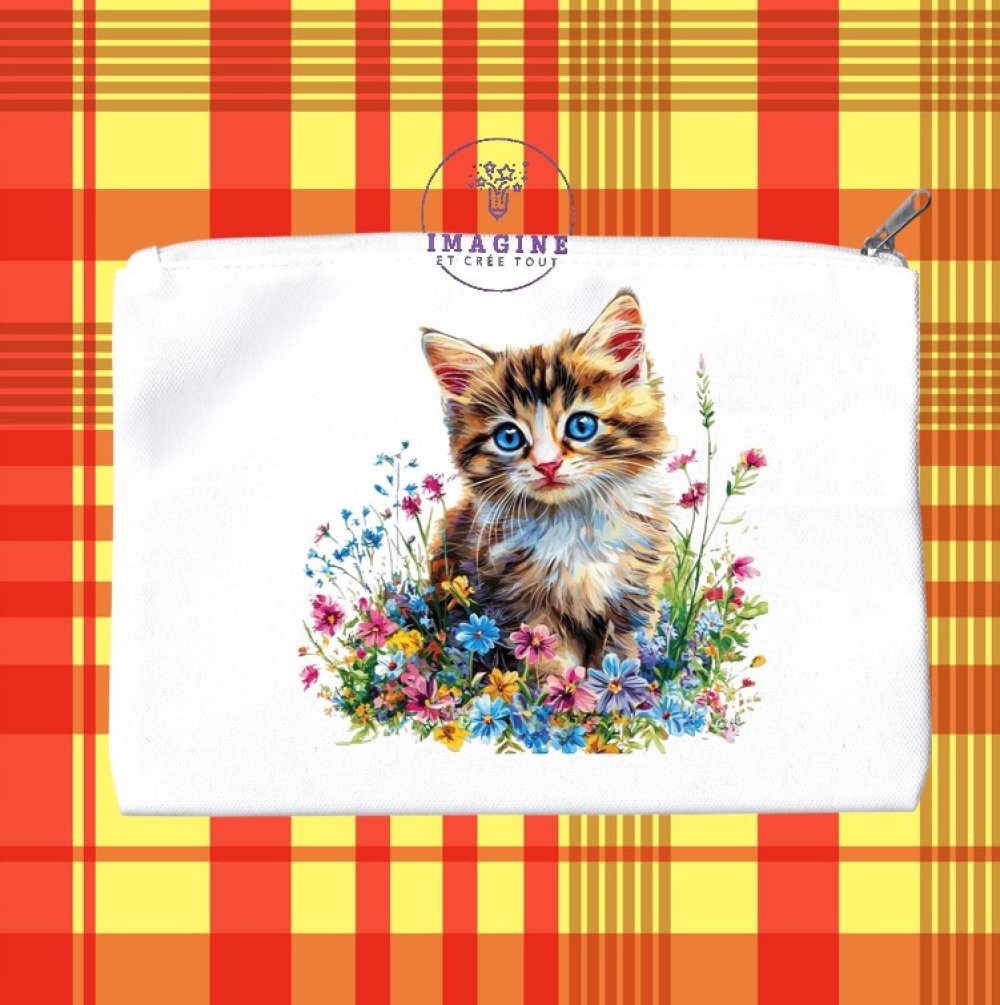 Trousse M - maquillage - sublimation - châton - chat - fleurs - animal domestique - prairie - pré