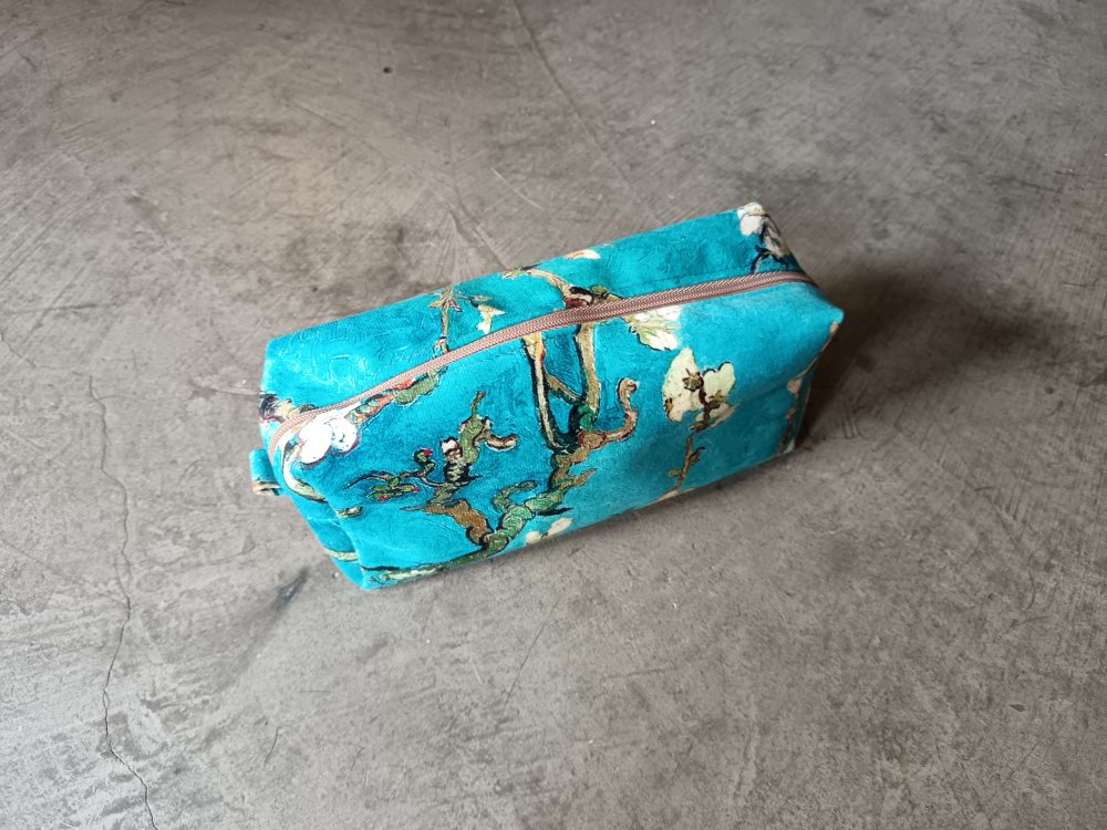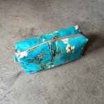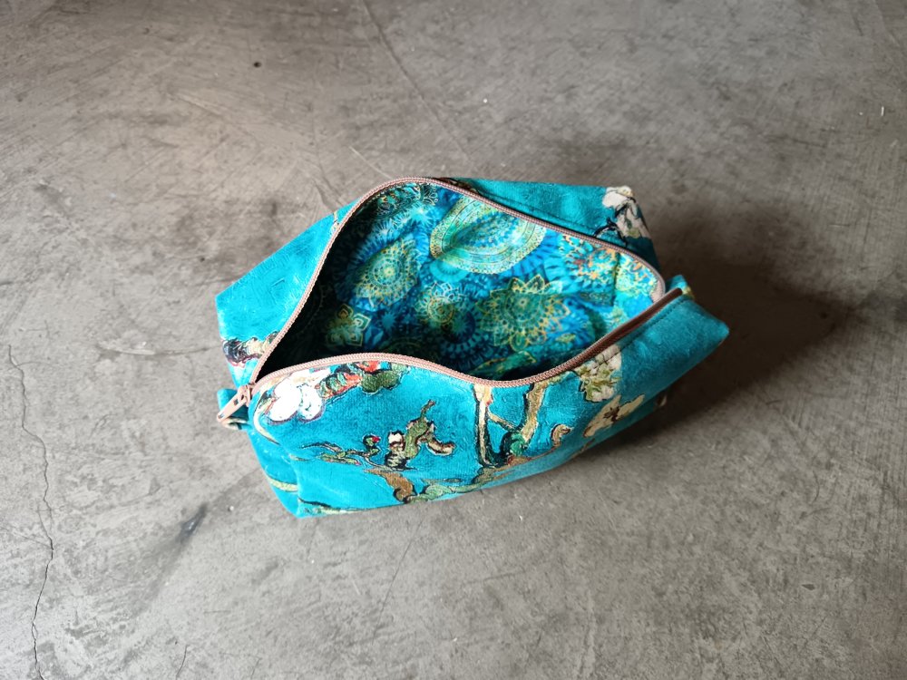 C'est une création unique faite main. Un très beau velours d'ameublement. La trousse a une grande contenance.