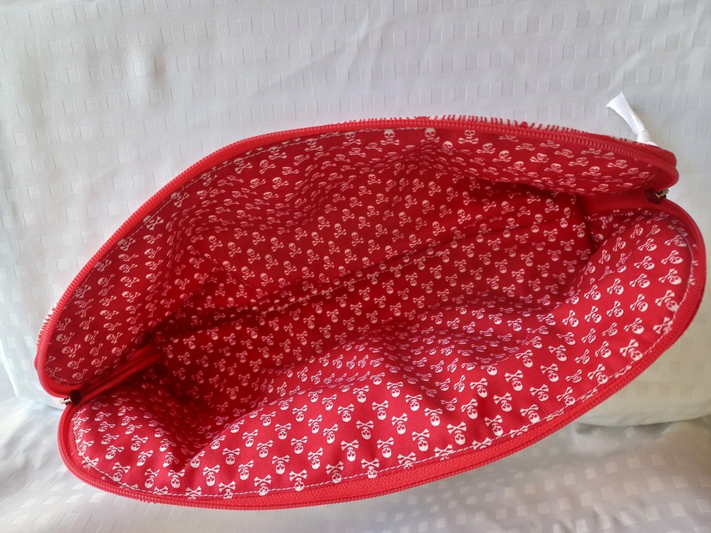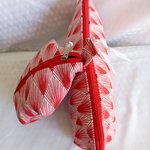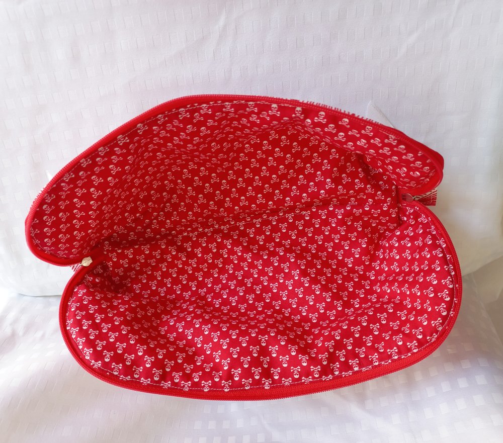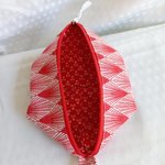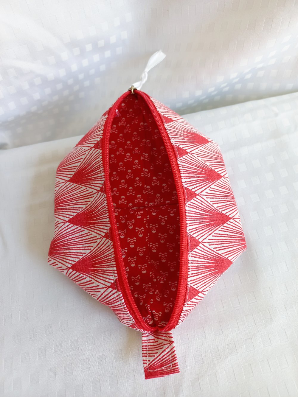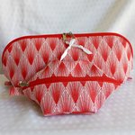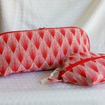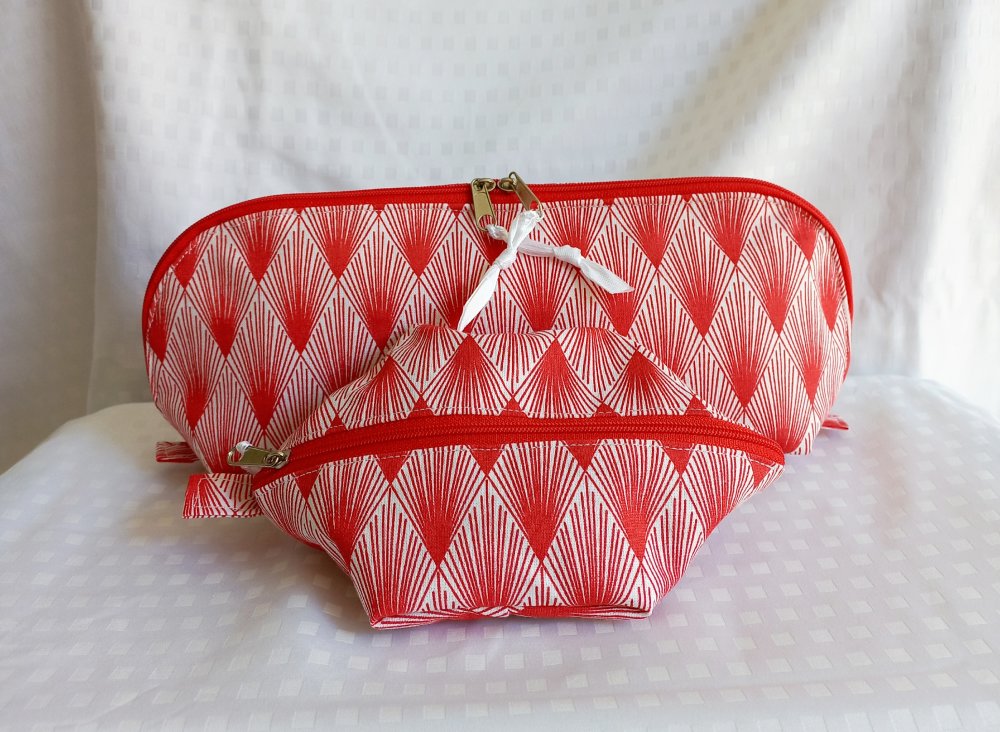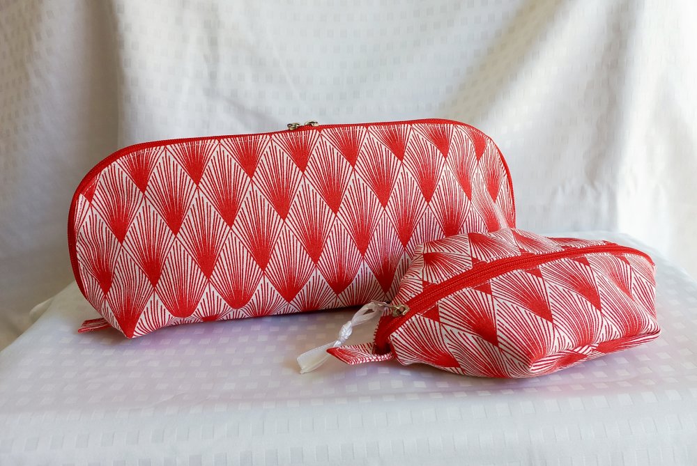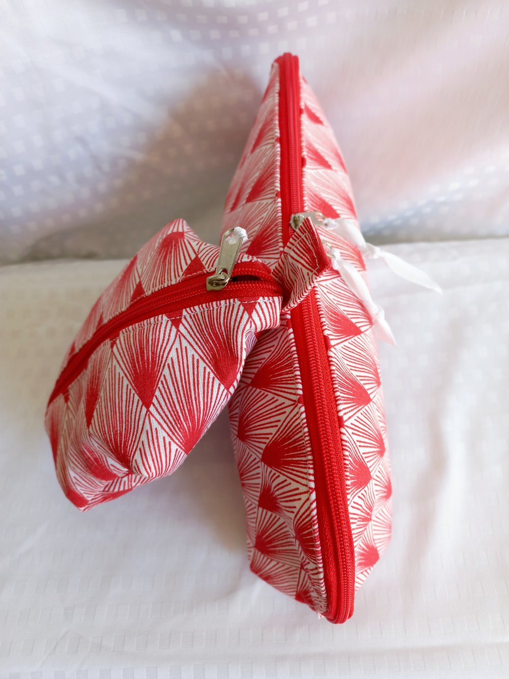 duo de trousse maquillage,toilette ou tout autre usage,tissu éventail et simili rouge,doublure rouge et blanche et fermeture éclair rouge pour les 2 trousses