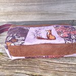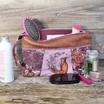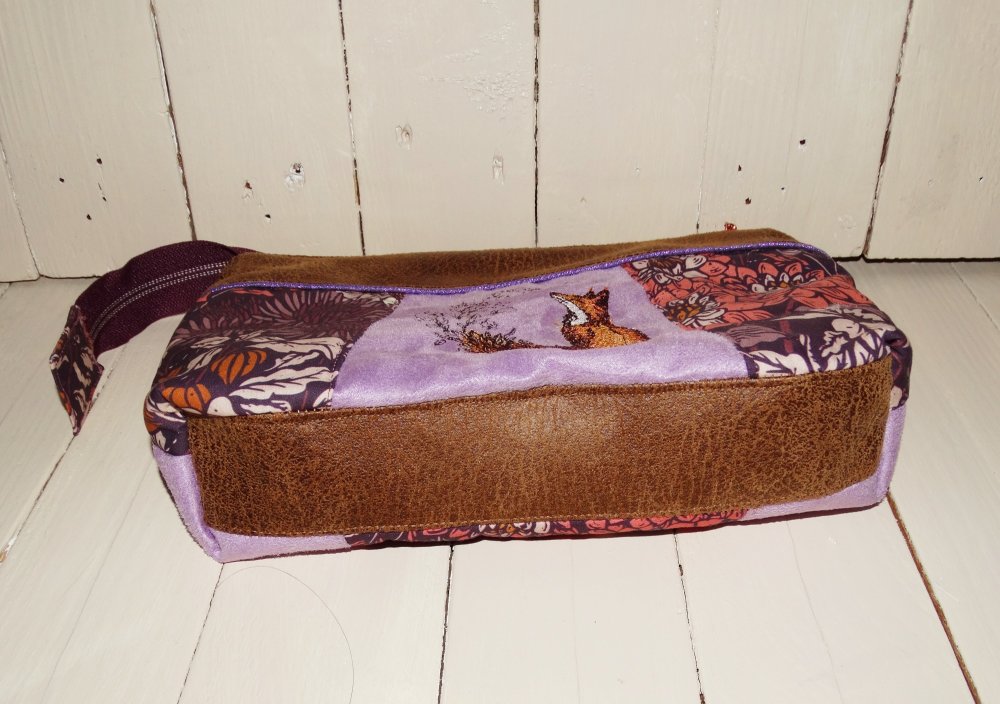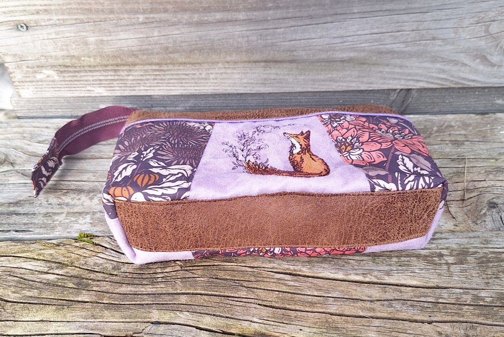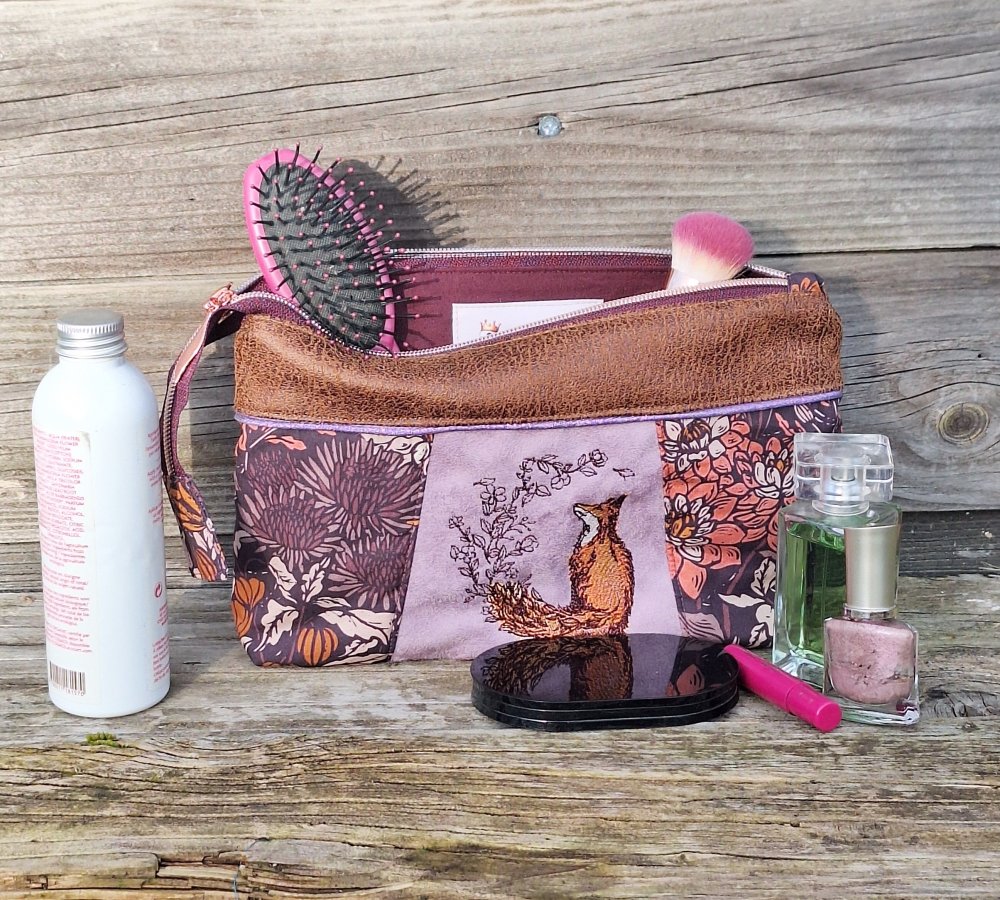 grande trousse à maquillage femme en faux cuir camel, suédine mauve et tissu aubergine avec fleurs, broderie renard, 2 compartiments zippés