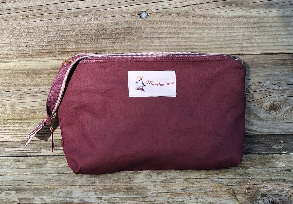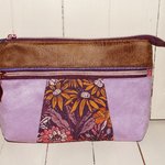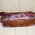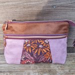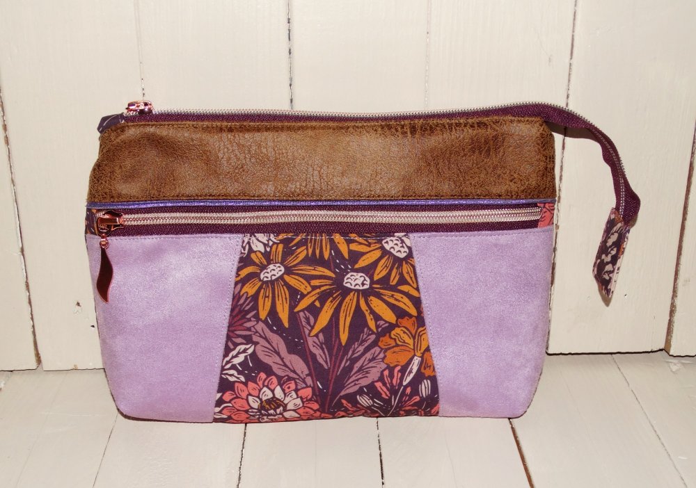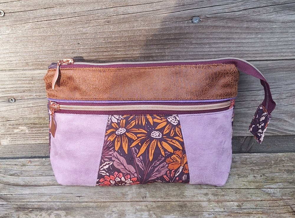 La trousse est entièrement doublée. L'extérieur est composé d'une suédine mauve , d'un faux cuir camel et d'un tissu aubergine avec des fleurs colorées aux couleurs automnales . La doublure est un coton aubergine.