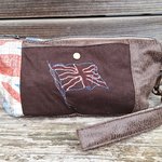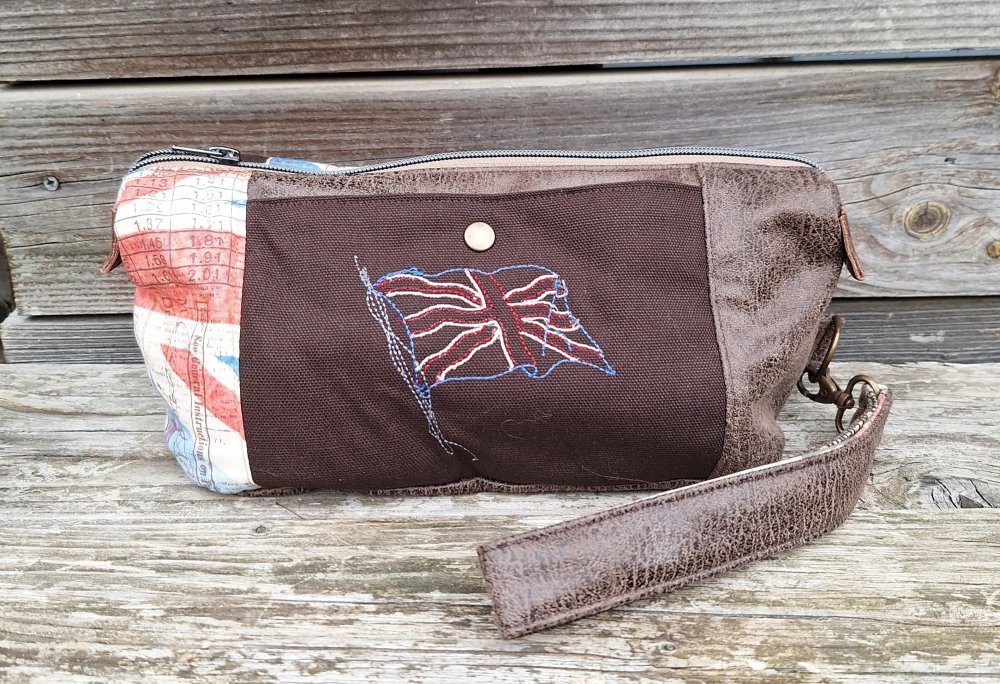 La trousse est décorée d'un côté par une broderie représentant un drapeau anglais, union jack