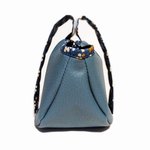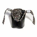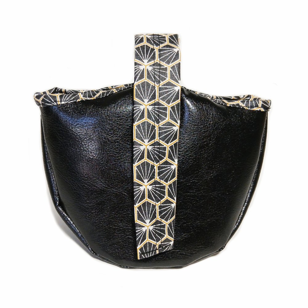 De couleur bleu pétrole ou noir brillant, elle est confectionnée dans un simili cuir fin et souple. Sa poche centrale est doublée d'un tissu imprimé aux motifs assortis, et se prolonge par un ruban qui se ferme grâce à un rond agrippant.