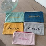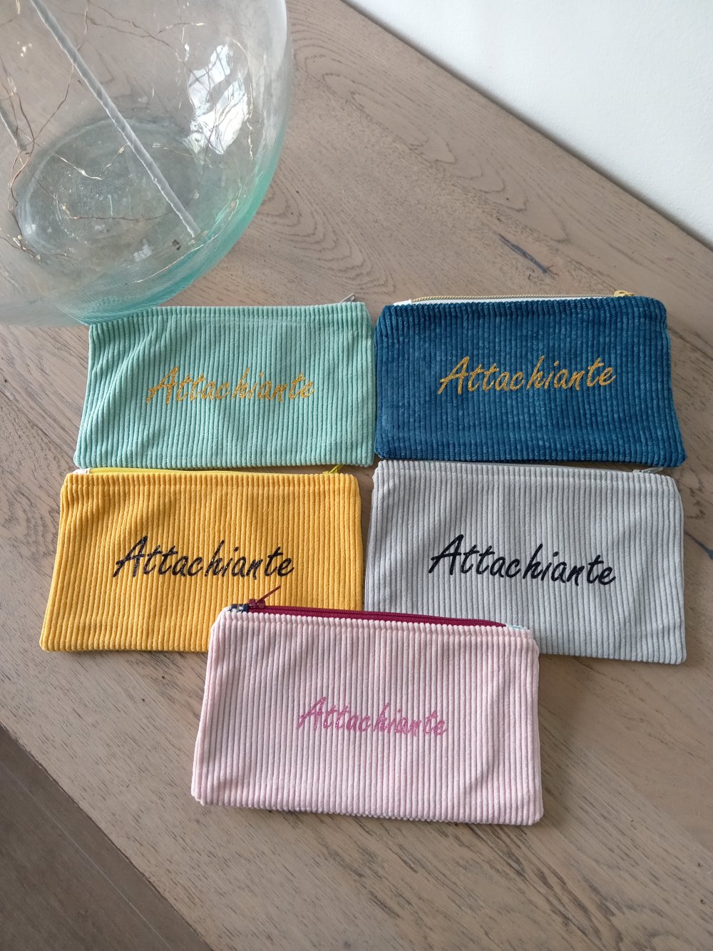 Trousse d'environ 10cm x 17cm, en velours côtelé floqué "attachiante".