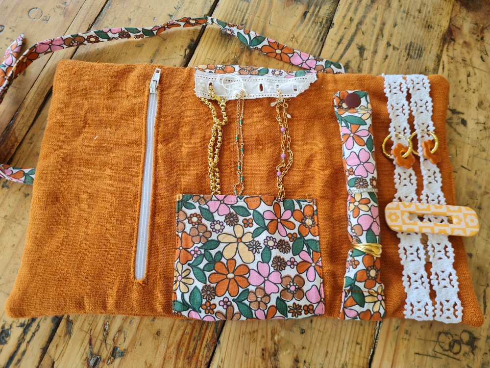 Ecrin à bijoux en lin et coton avec poche zippé rangement bague, collier, boucles d'oreilles