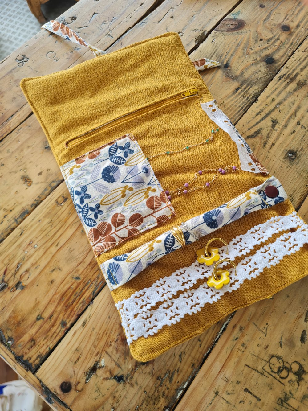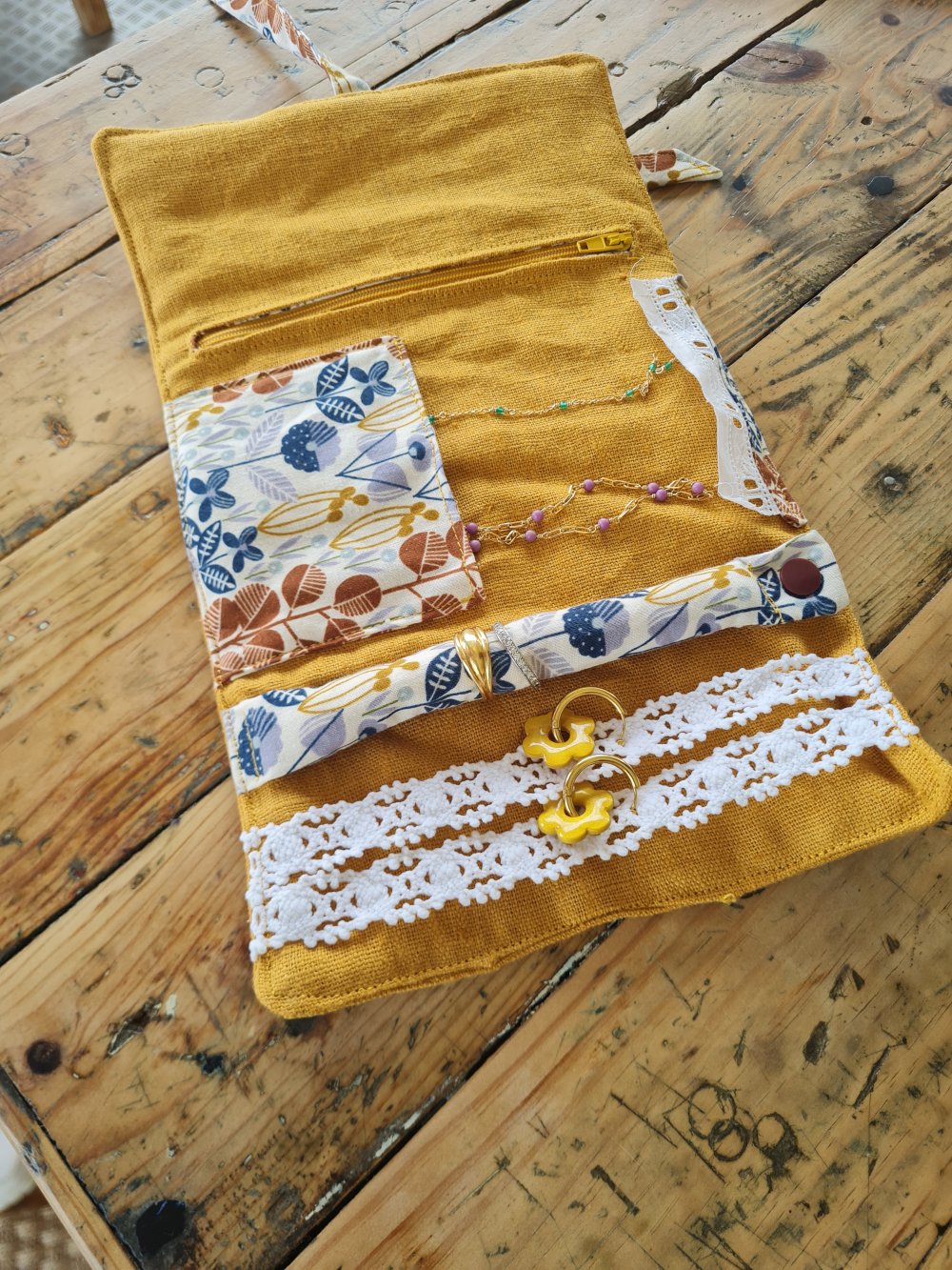 Ecrin à bijoux en lin et coton avec poche zippé rangement bague, collier, boucles d'oreilles
