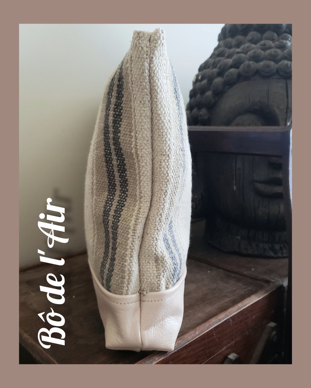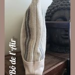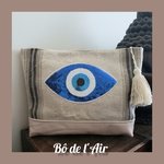 Pochette confectionnée à partir de bachette épaisse beige , rayures bleues et beiges, provenant d'un stock dormant, mixée avec du cuir ancien beige . Œil porte-bonheur Matiasma, sequins , cousu et thermocollé sur le devant.