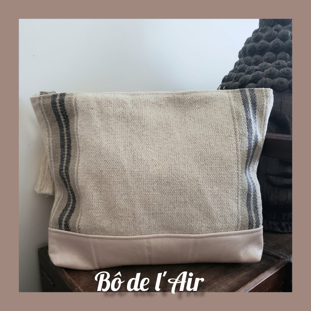 La pochette se ferme par fermeture éclair avec un joli pompon en coton beige.