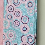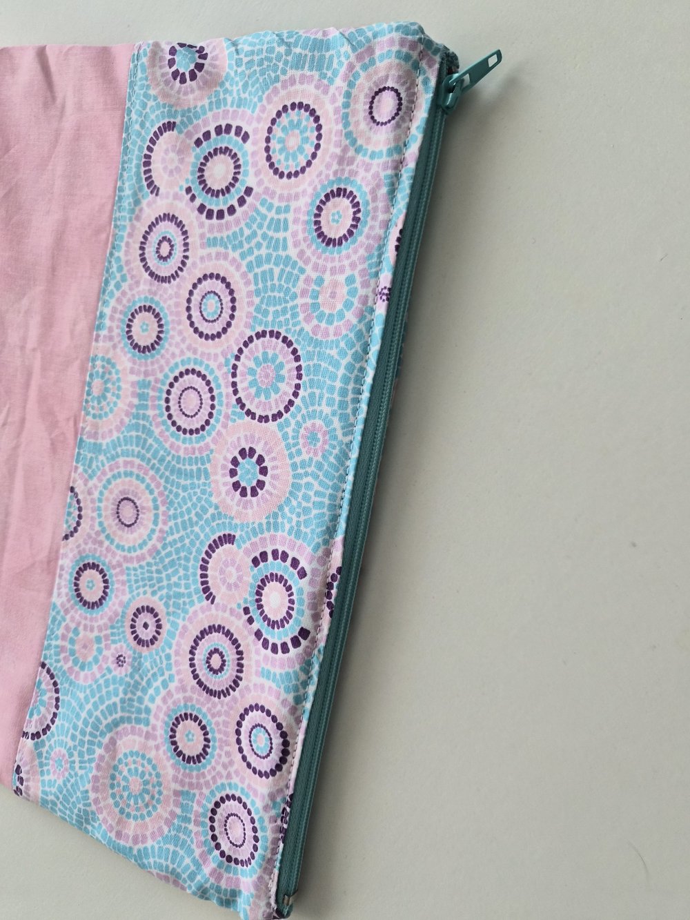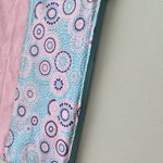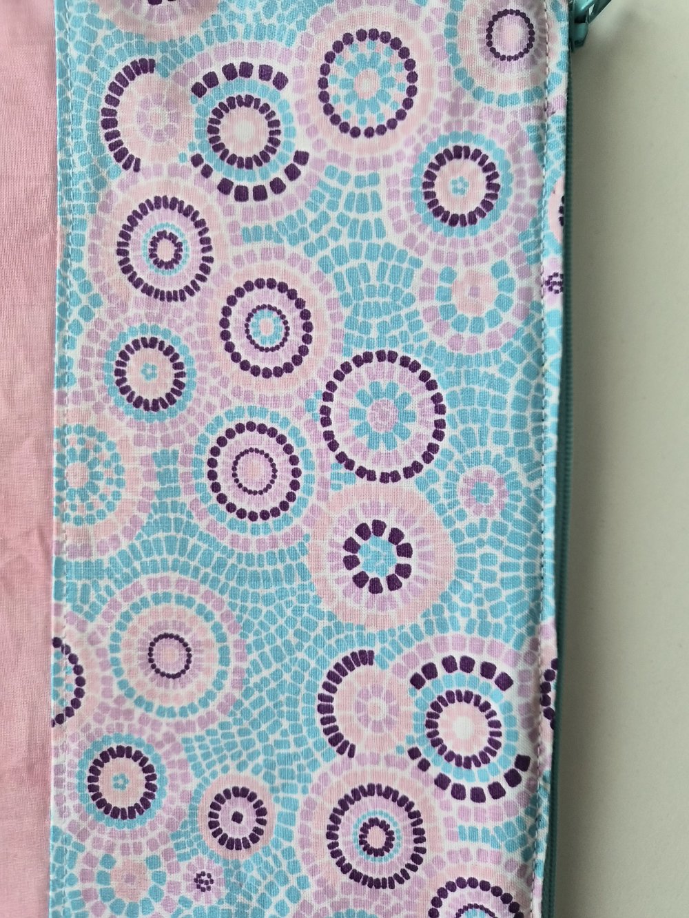D'un coté, un motif graphique composé de cercles concentriques dans des tons violets, rose et bleu, rappelant un style mosaïque moderne et lumineux. De l'autre, un rose pastel uni, doux et élégant, qui équilibre parfaitement l'énergie du motif.