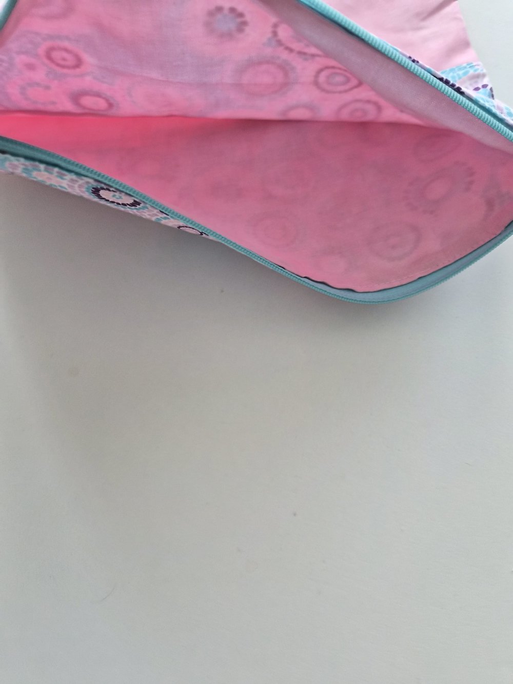 Pratique et pleine de charme, cette pochette plate est réalisée en 100% coton, avec un duo de tissus qui attire immédiatement l'œil.