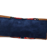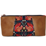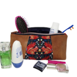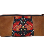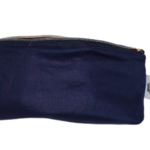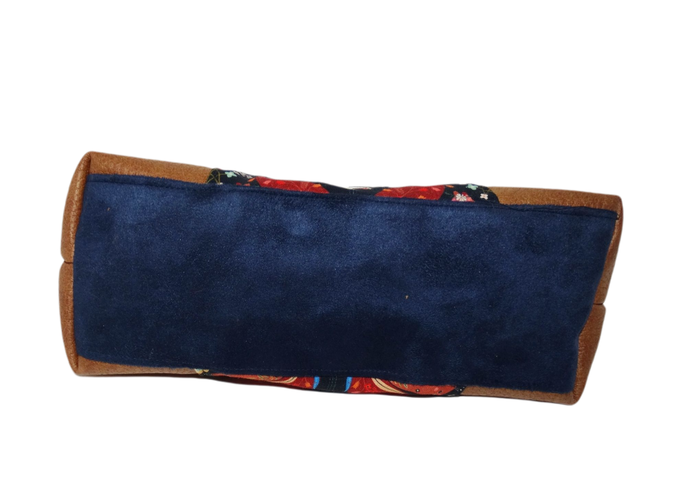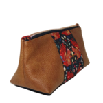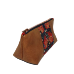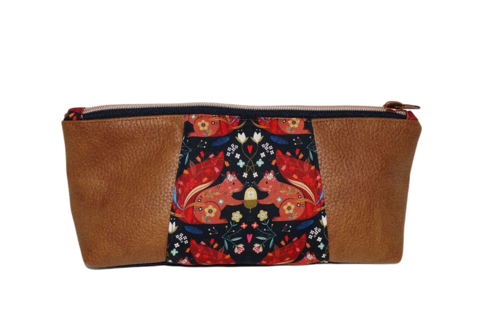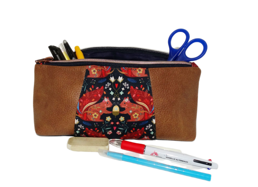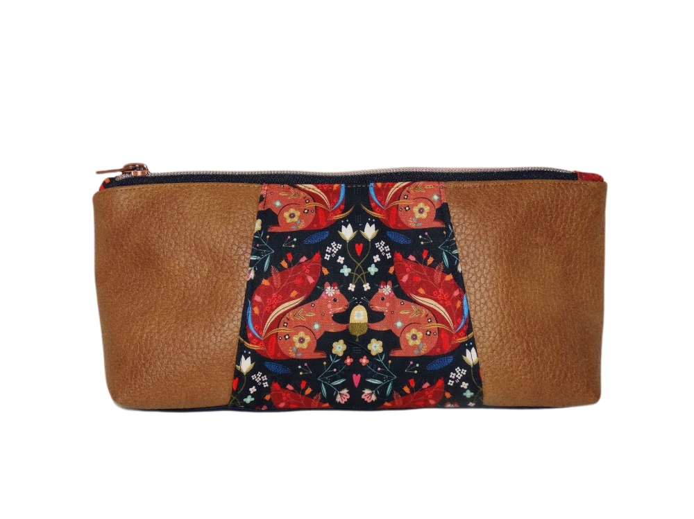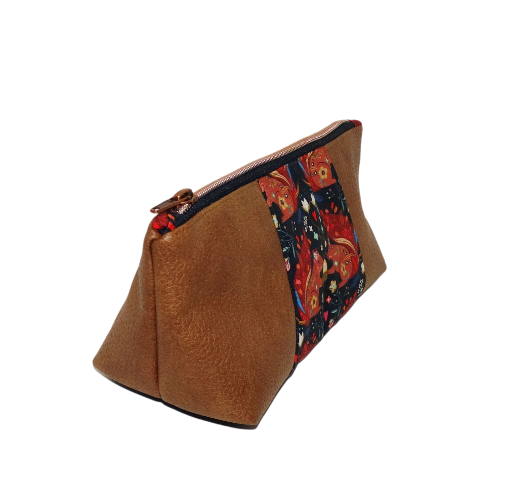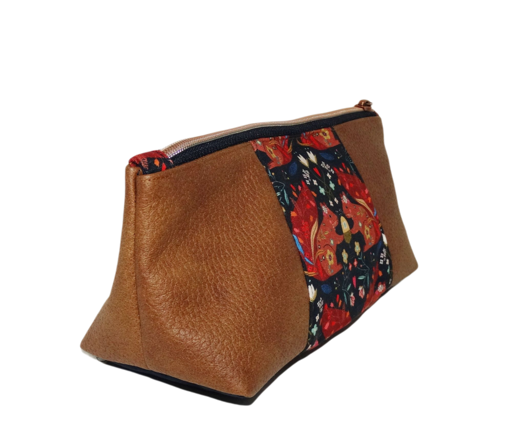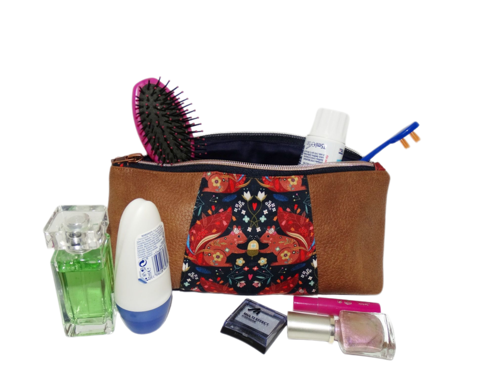 La trousse de toilette est entièrement doublée. L'extérieur est en simili cuir camel, en suédine bleu marine et en tissu en coton noir avec des écureuils et des fleurs. Elle est doublée dans un coton uni bleu marine.