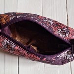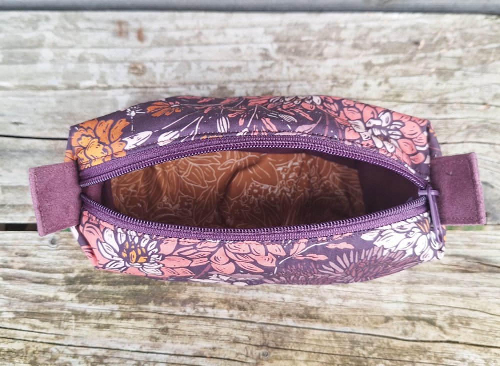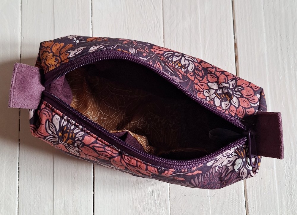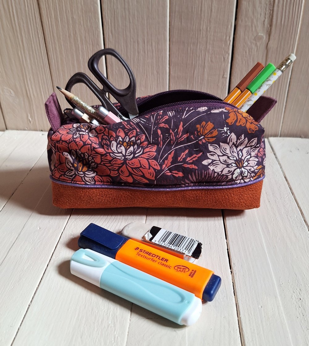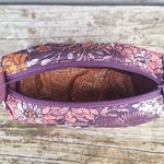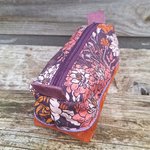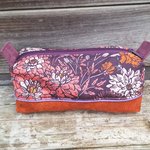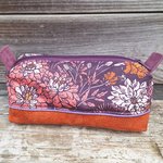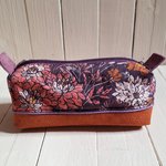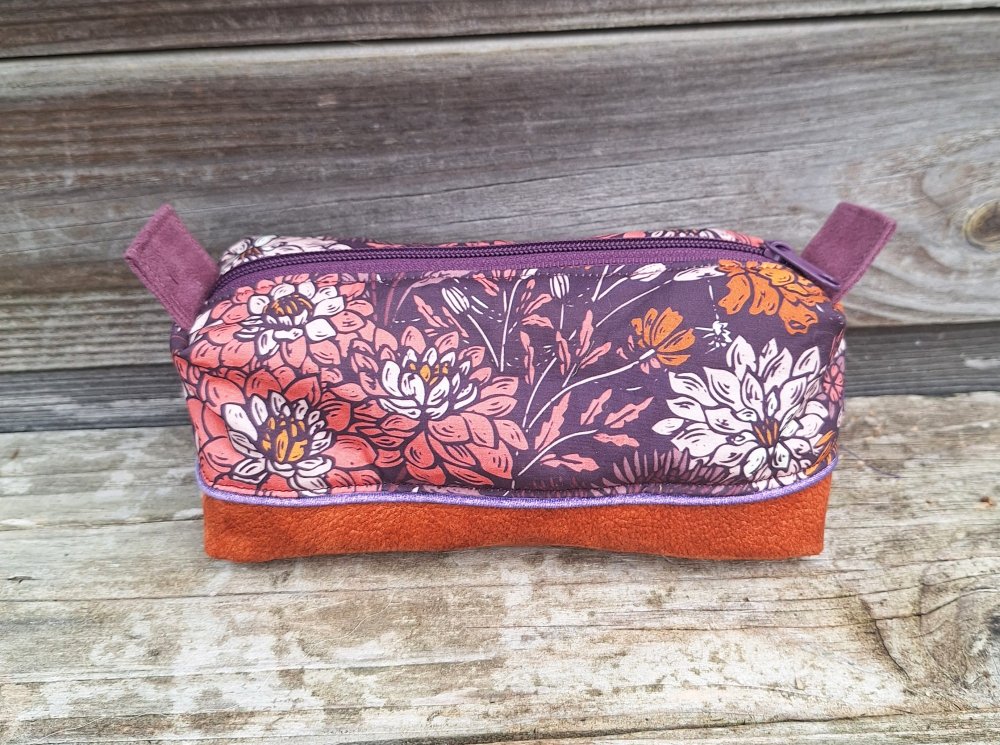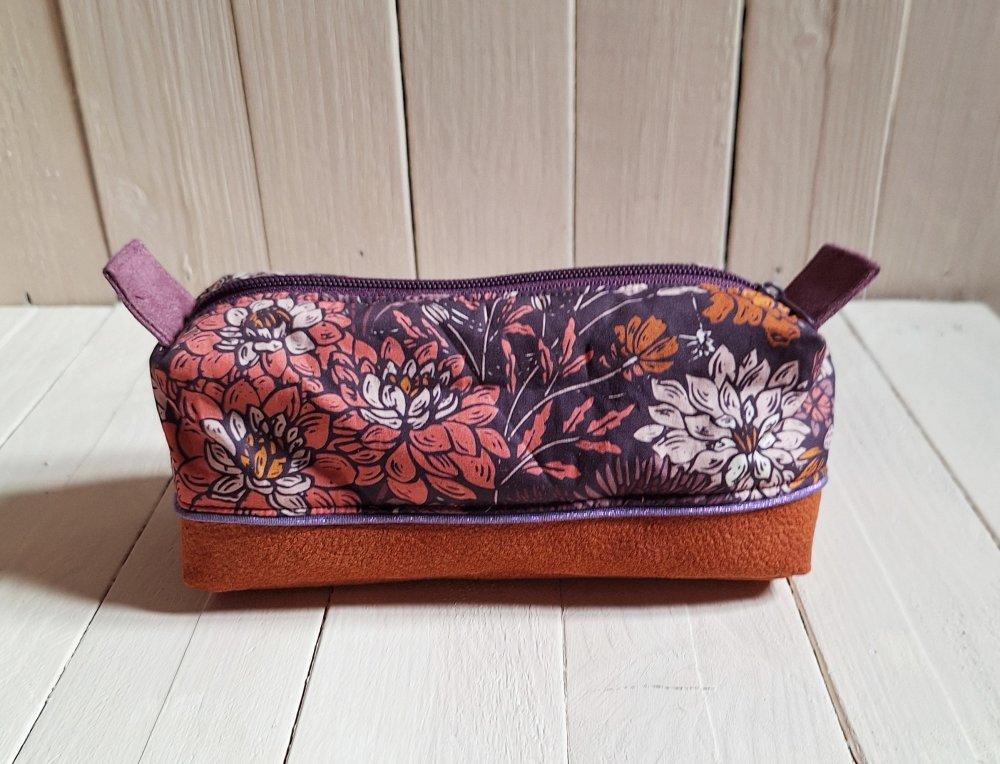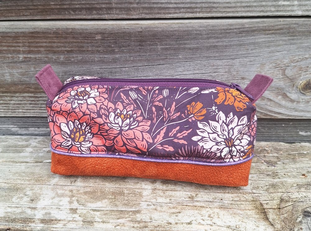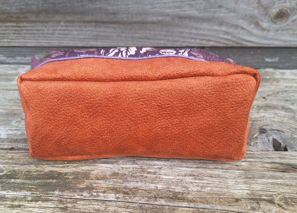 La trousse est entièrement doublée. L'extérieur est composé d'un similicuir orange et d'un coton aubergine avec des fleurs automnales. La doublure est un coton aubergine.
