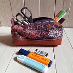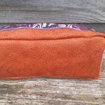 trousse à crayons et stylos pour femme, tissu aubergine avec des fleurs automnales et faux cuir oranges, trousse de toilette, trousse à crayons et stylos