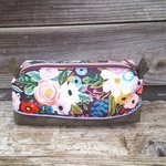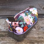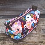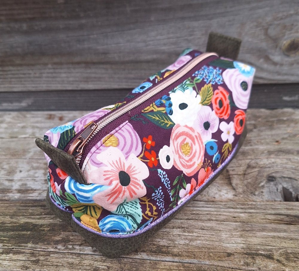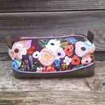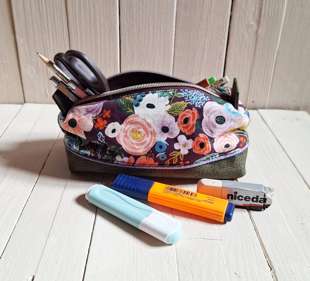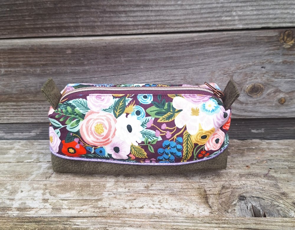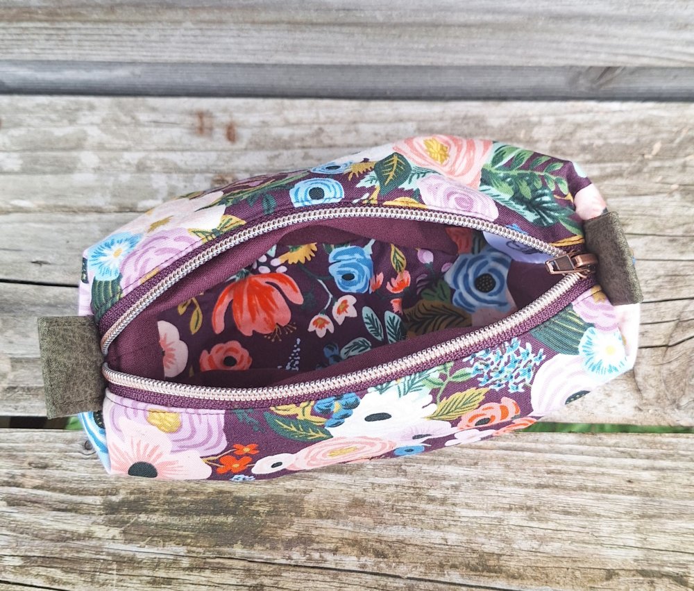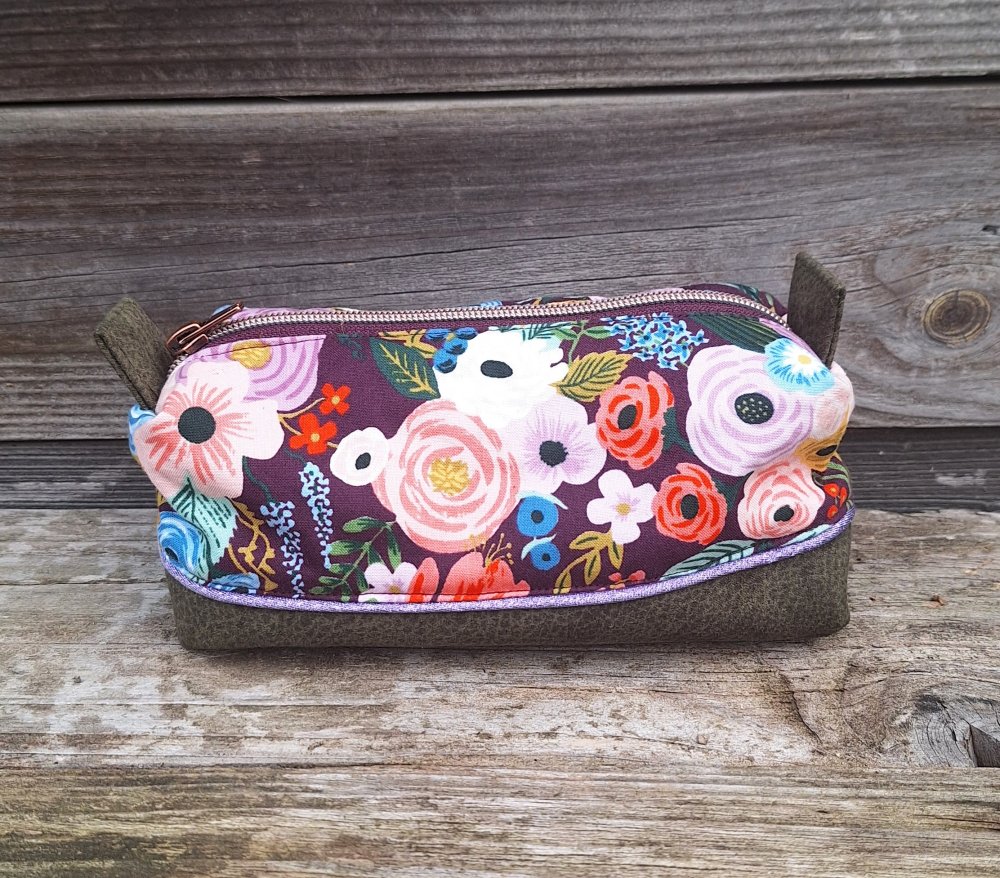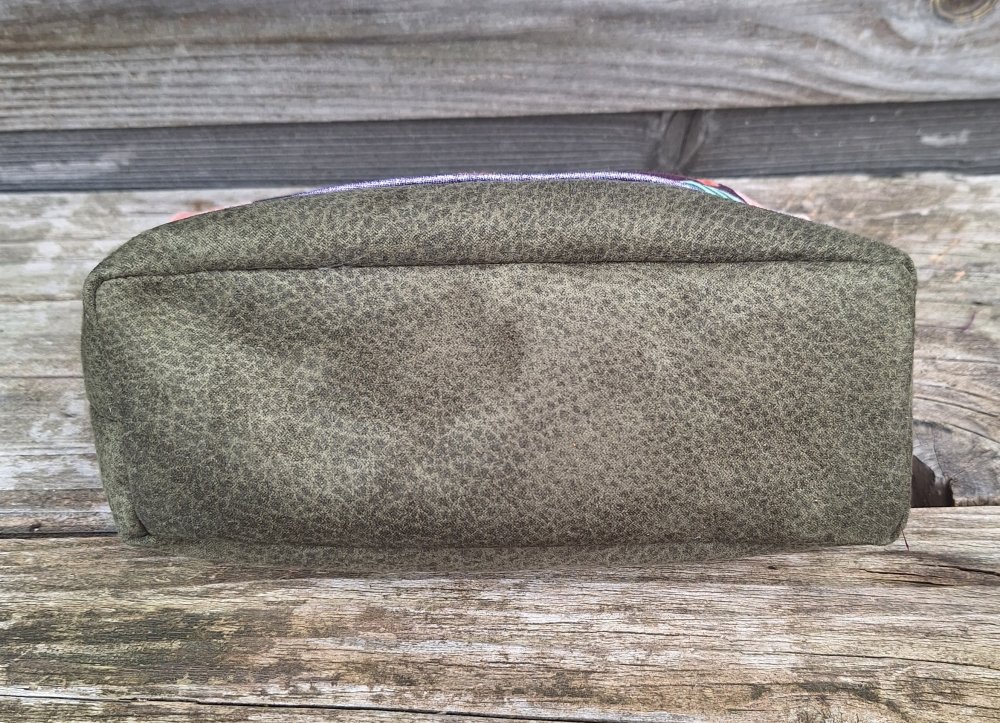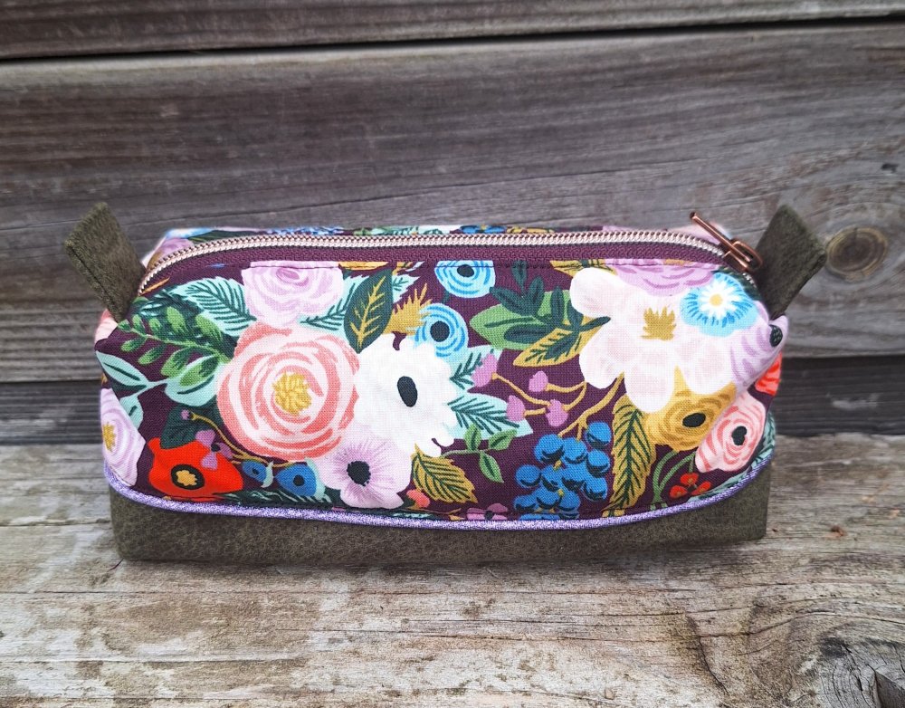 La trousse est entièrement doublée. L'extérieur est composé d'un similicuir kaki et d'un coton aubergine avec des fleurs multicolores. La doublure est un coton aubergine.