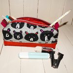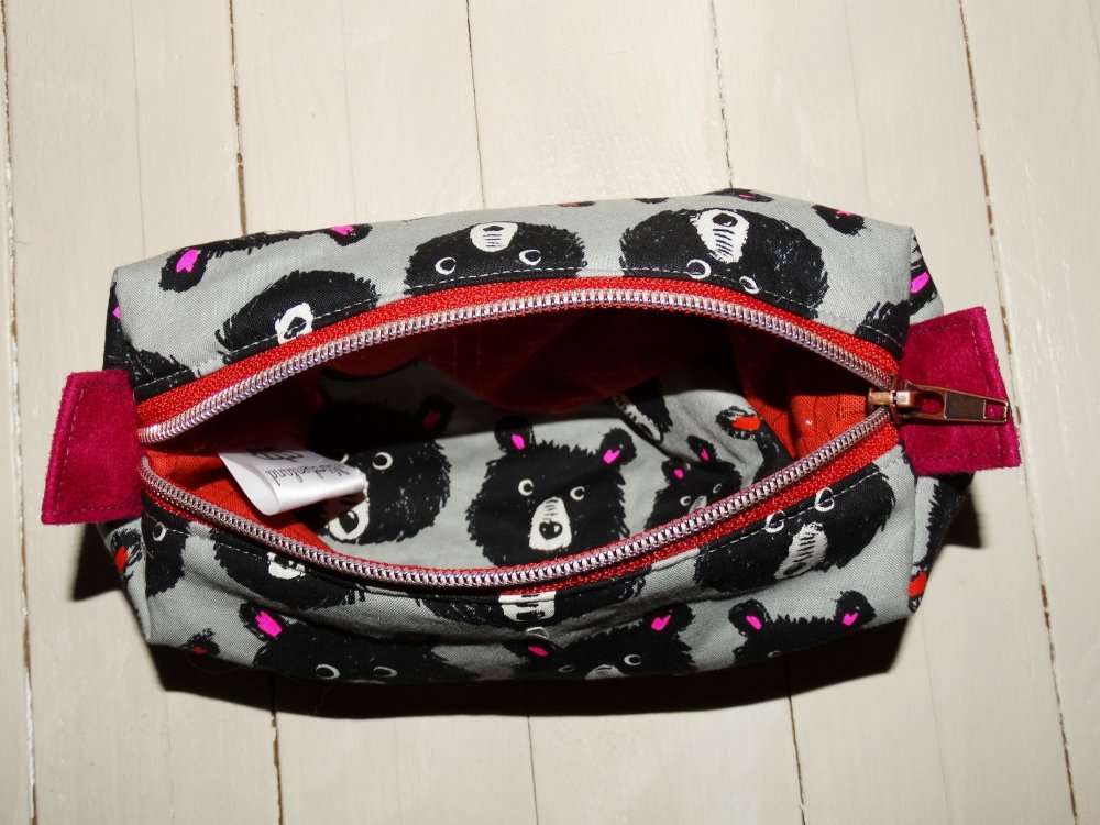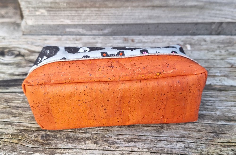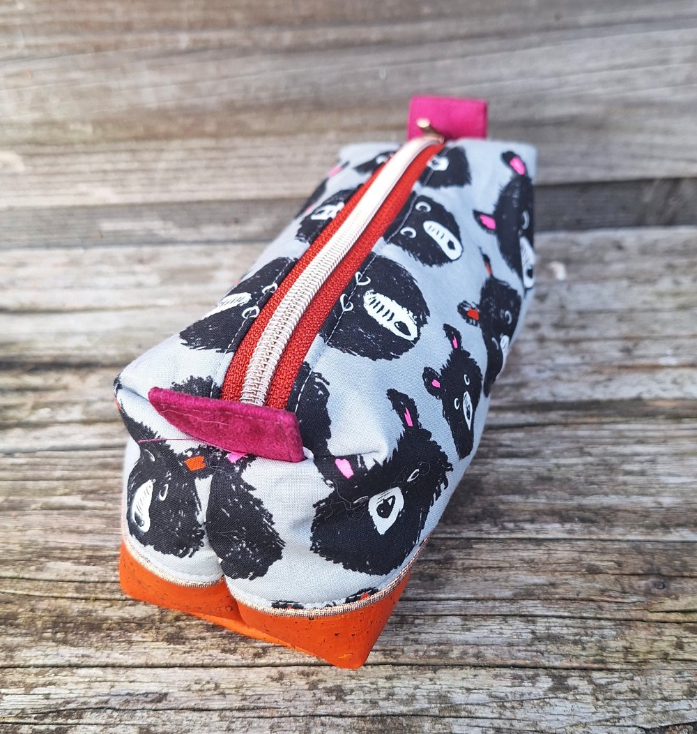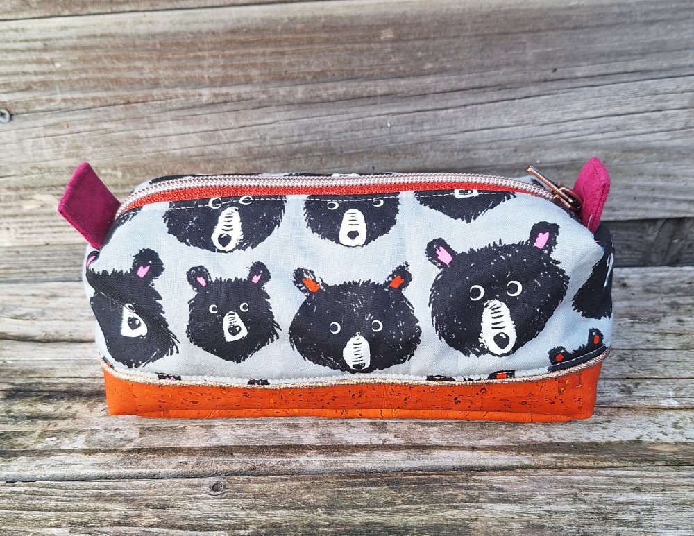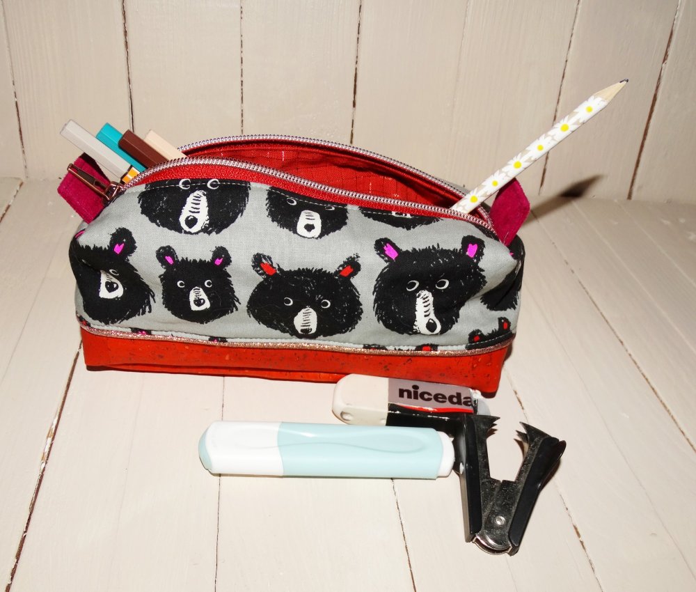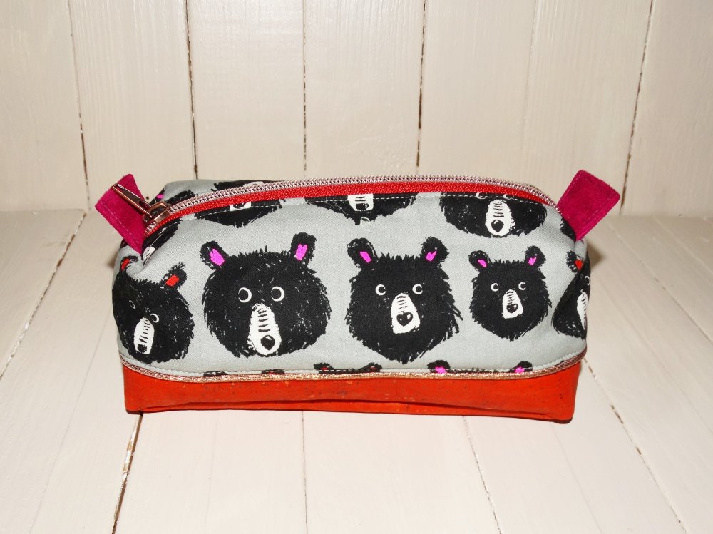 La trousse est entièrement doublée. L'extérieur est composé d'un liège orange et d'un coton gris avec des ours. La doublure est un coton orange avec des carreaux en fil lurex.
