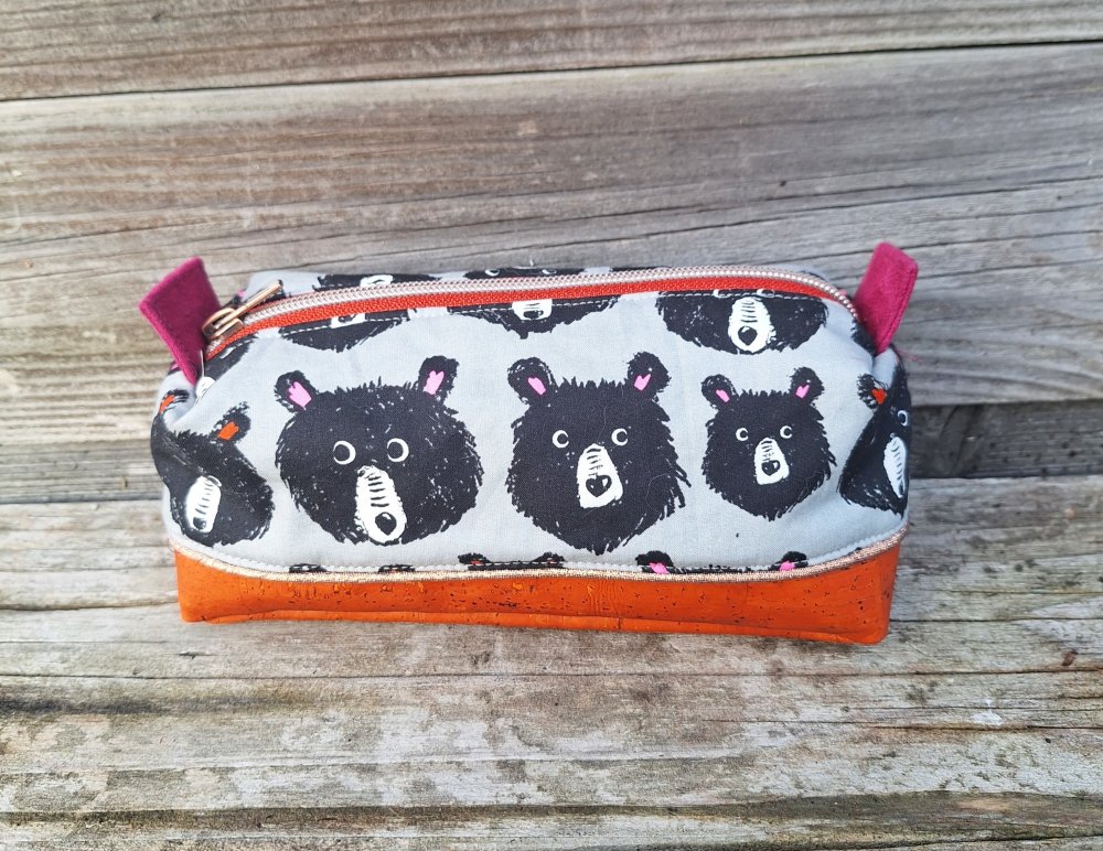 trousse à stylos et crayons pour femme , pochette à maquillage en tissu gris avec des oursons et liège orange, fourre-tout mignon, trousse de toilette, trousse à crayons et stylos