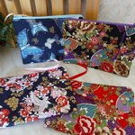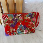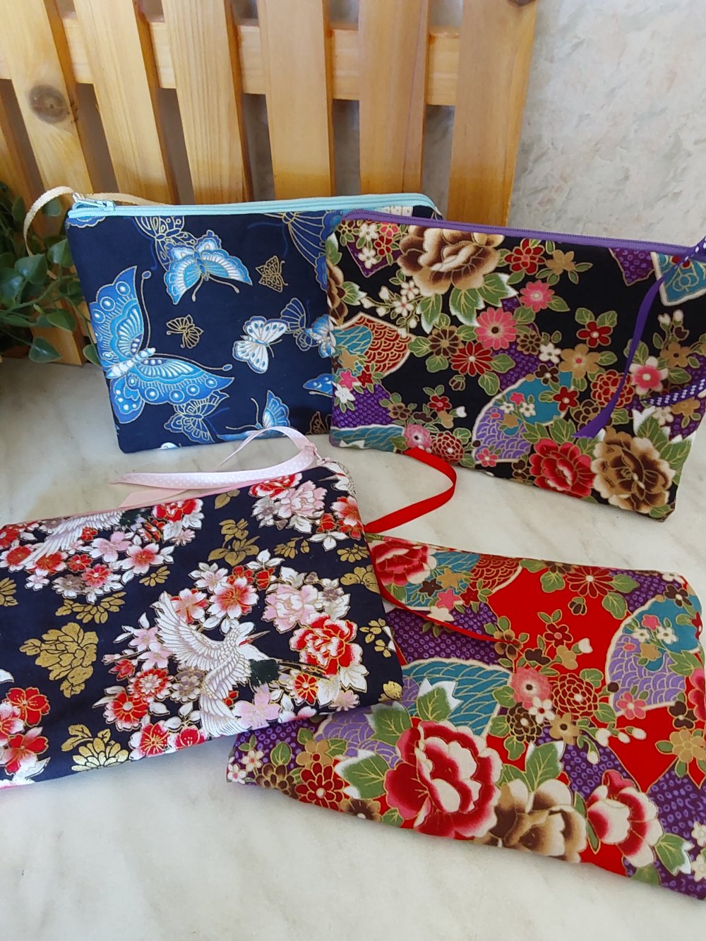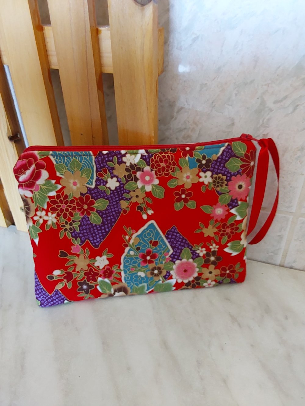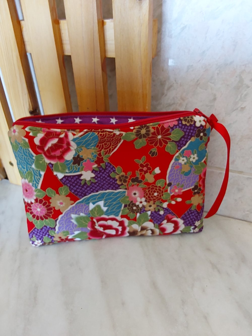 Cette trousse est confectionnée dans un tissu japonais multicolore ; elle est doublée et molletonnée avec un zip rouge pour la fermer.