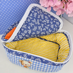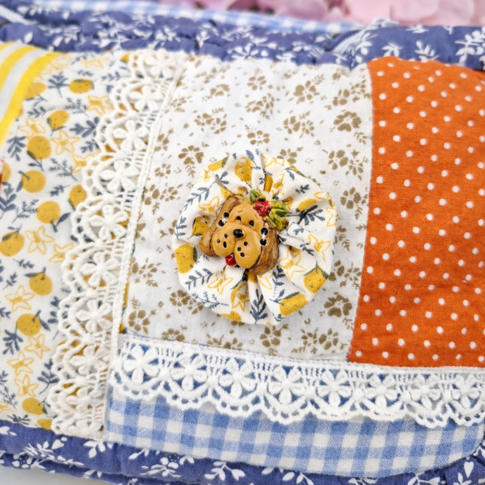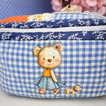 Matériaux : Tissus de coton de qualité, patchwork de motifs floraux, carreaux et pois, appliqué en tissu avec illustration de nounours