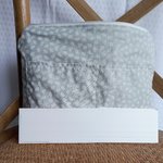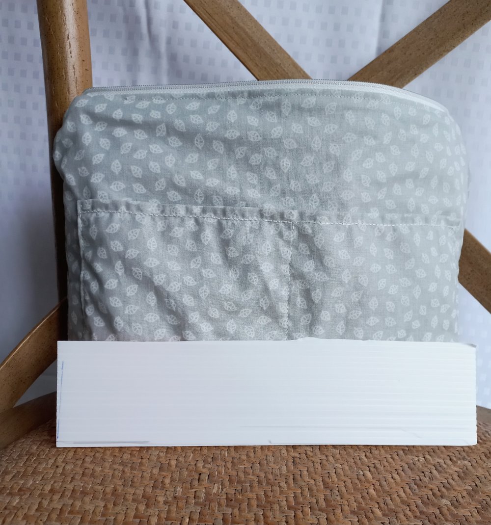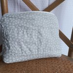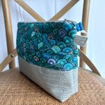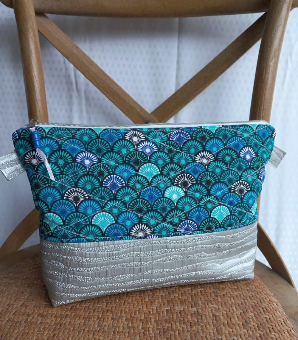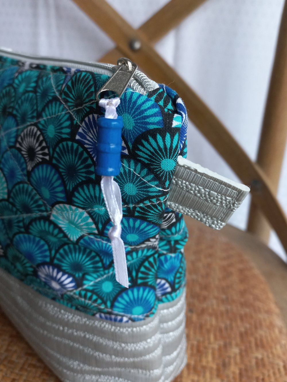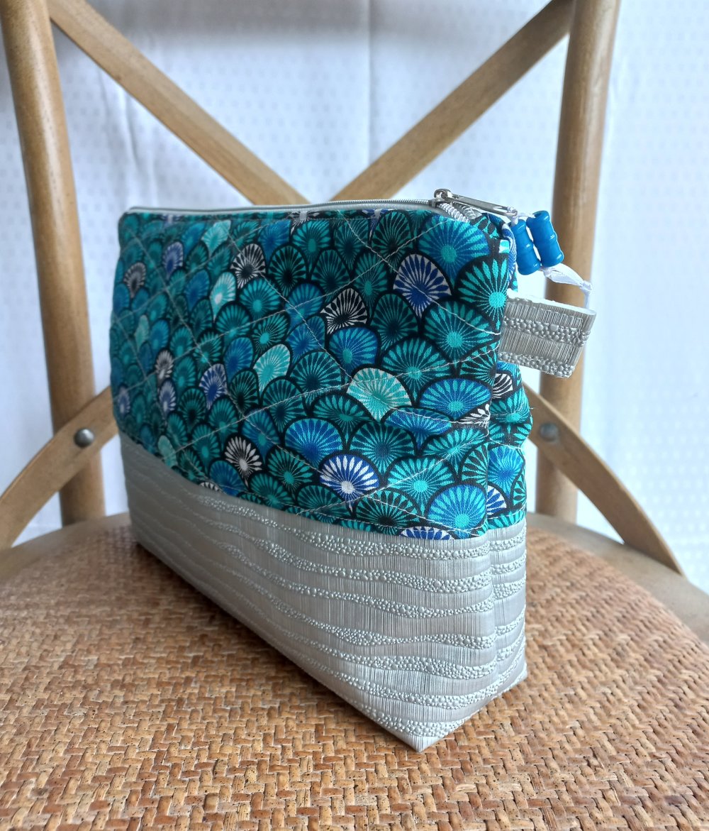 Trousse de toilette, tissu matelassé bleu a motifs éventails, simili cuir argenté,doublée avec 2 poches plaquées