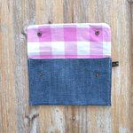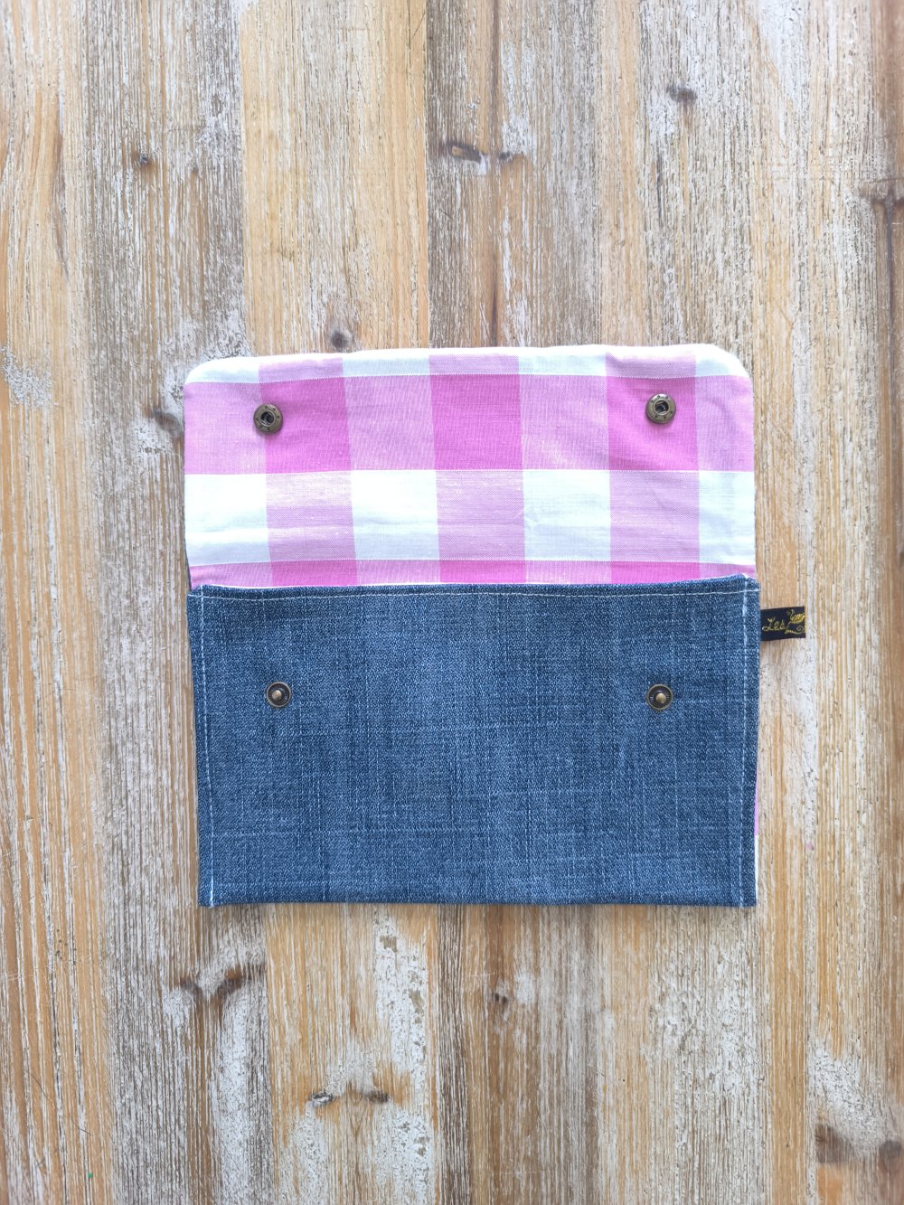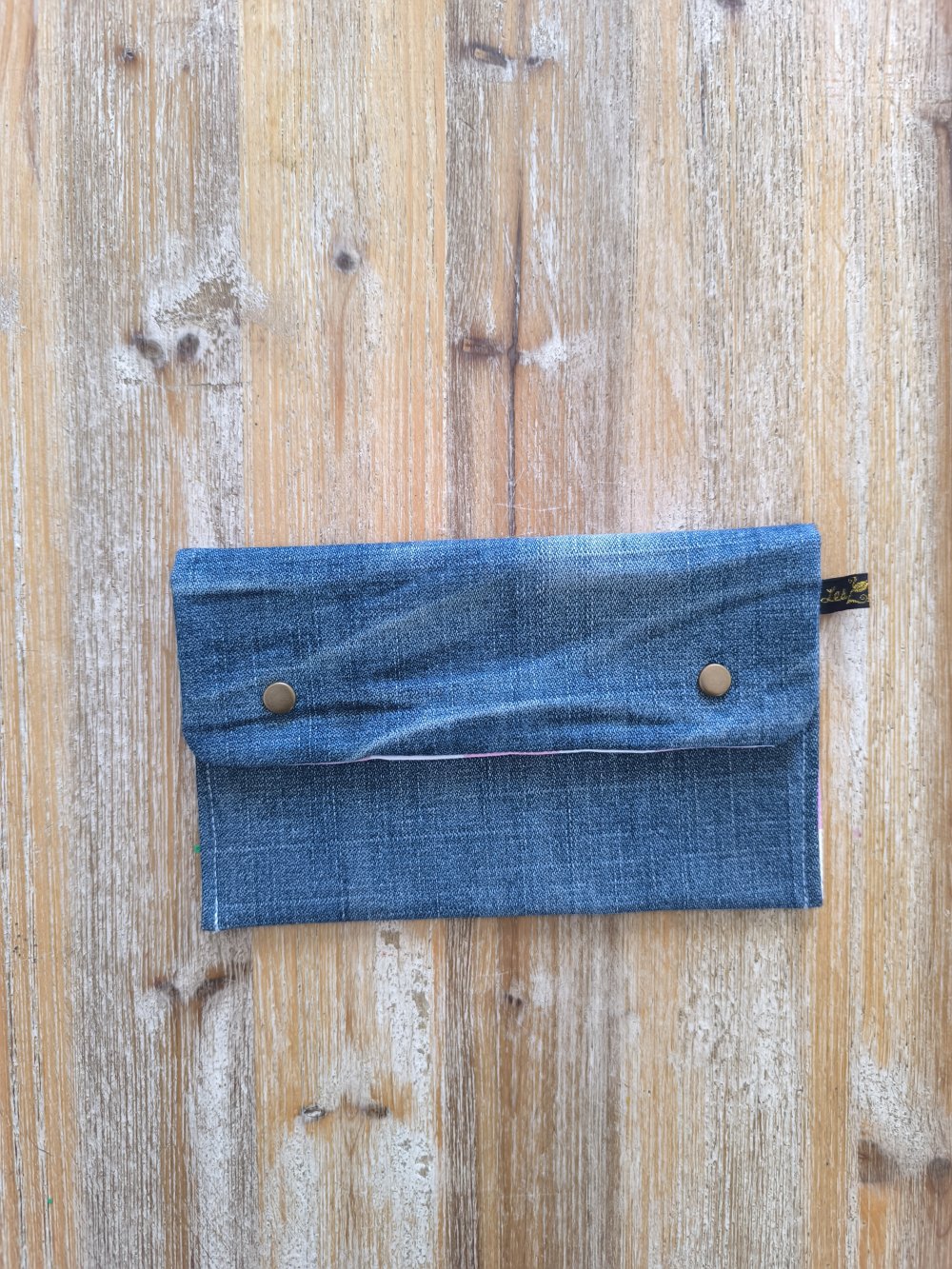 Confectionnée à partir de morceaux de jeans soigneusement sélectionnés et nettoyés par nos soins, Chaque trousse est doublée en coton et fermée avec des boutons en laiton.