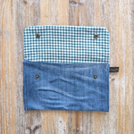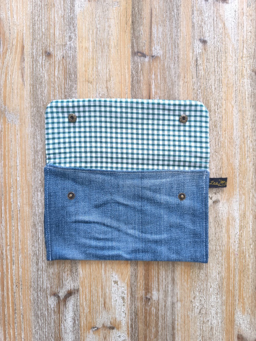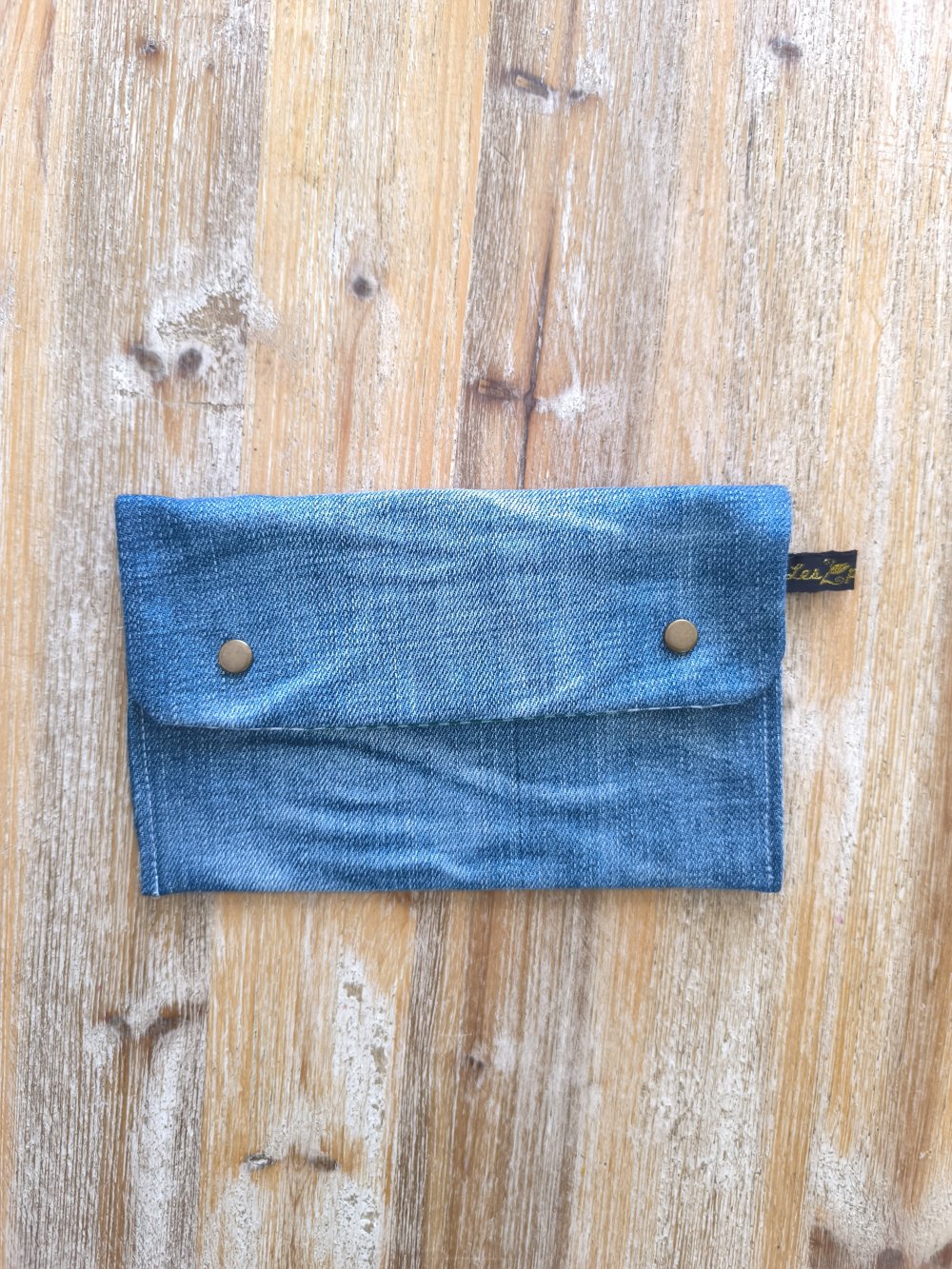 Confectionnée à partir de morceaux de jeans soigneusement sélectionnés et nettoyés par nos soins, Chaque trousse est doublée en coton et fermée avec des boutons en laiton.