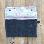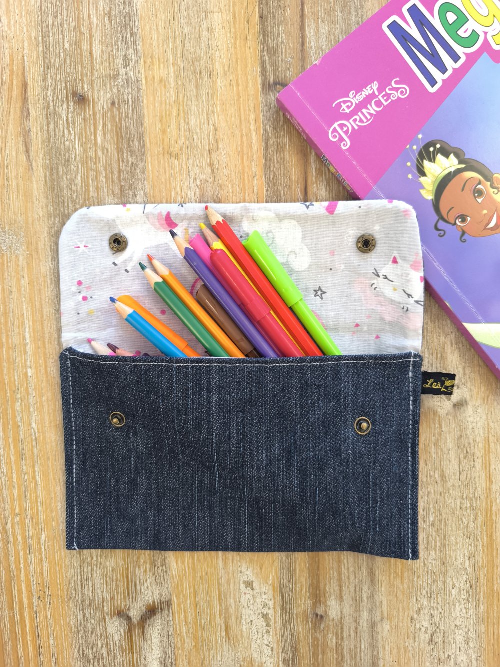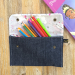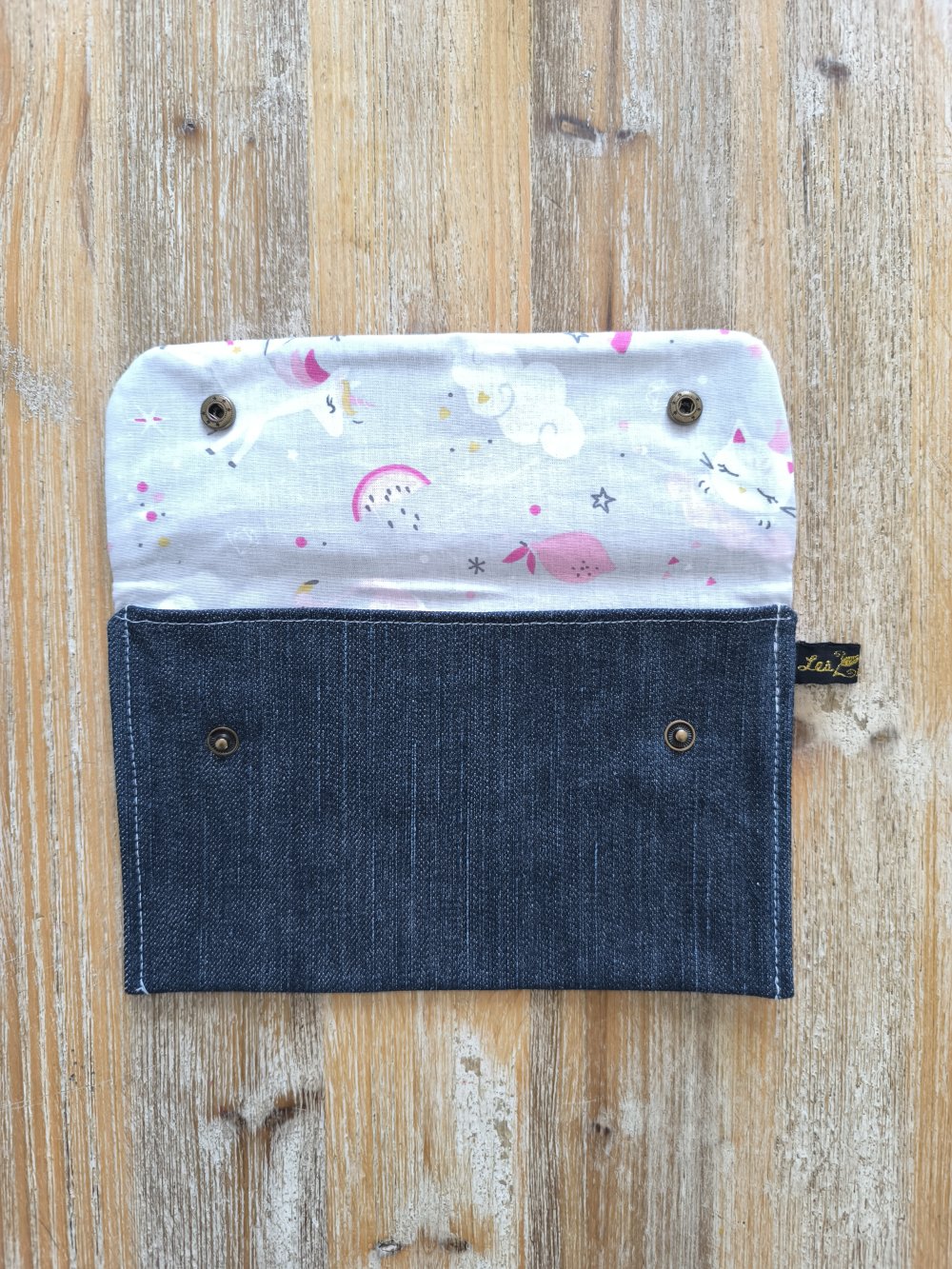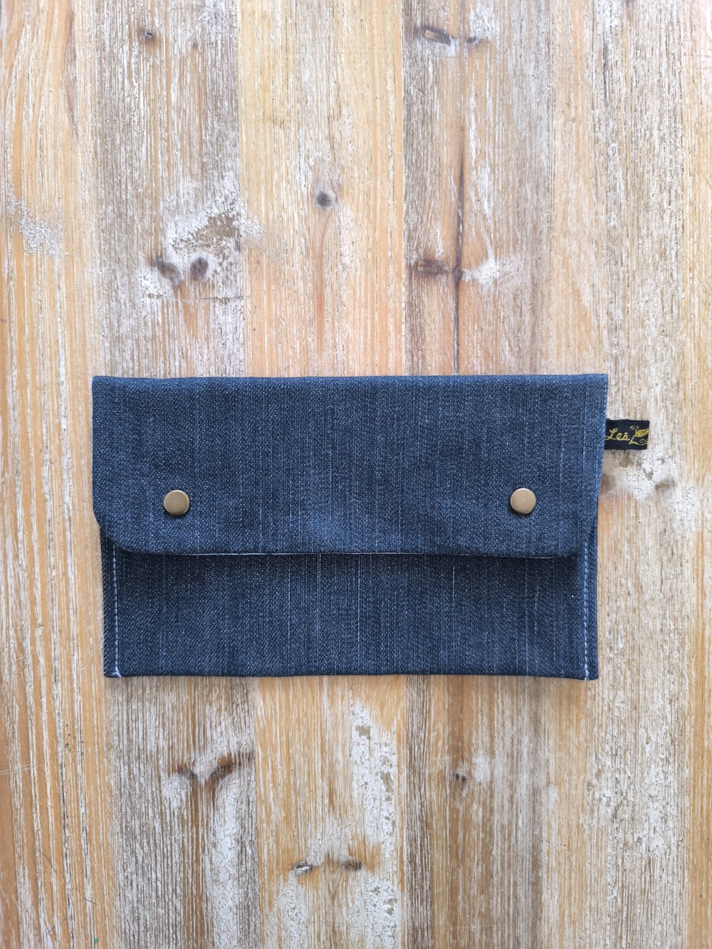 Confectionnée à partir de morceaux de jeans soigneusement sélectionnés et nettoyés par nos soins, Chaque trousse est doublée en coton et fermée avec des boutons en laiton.