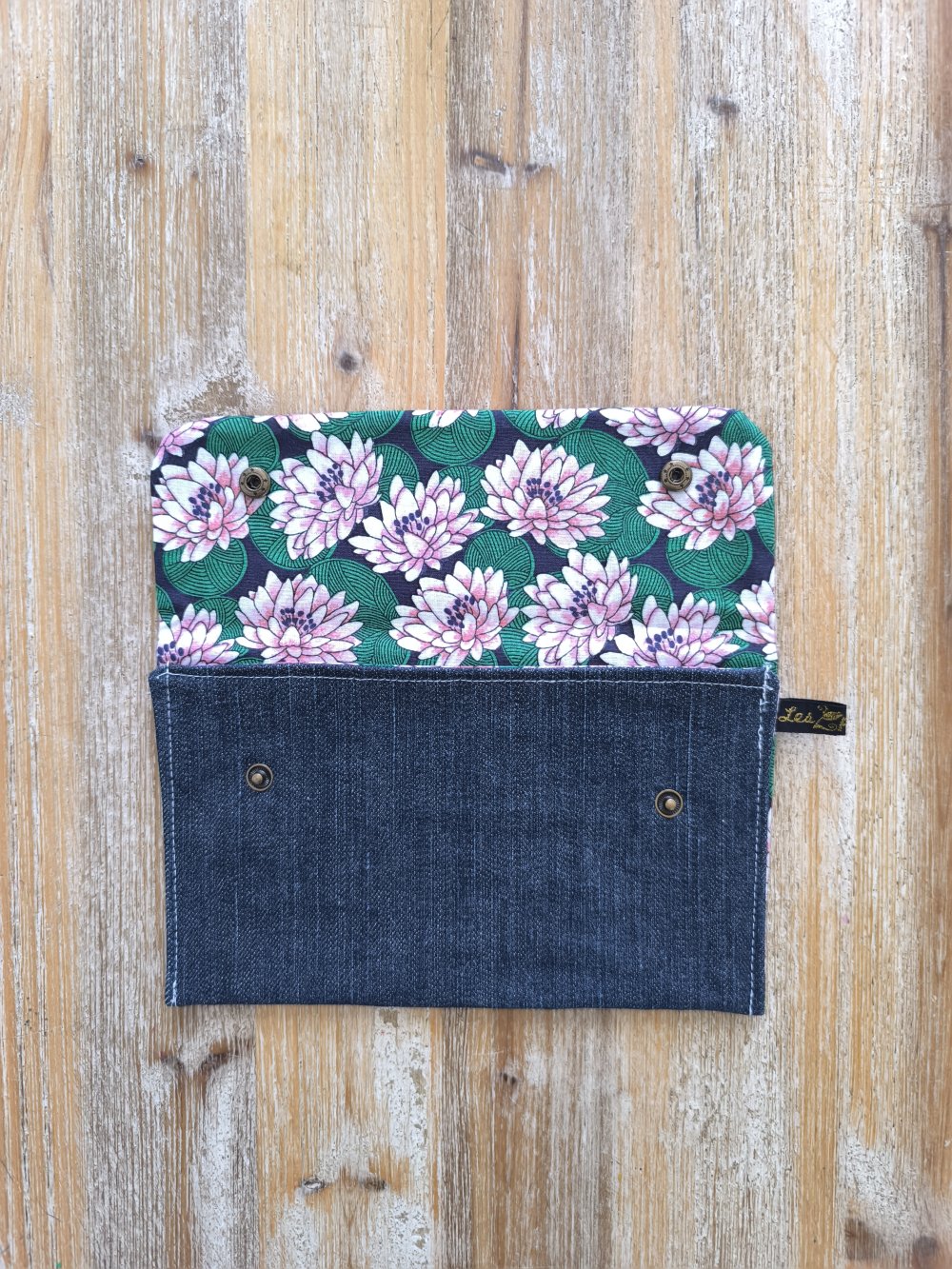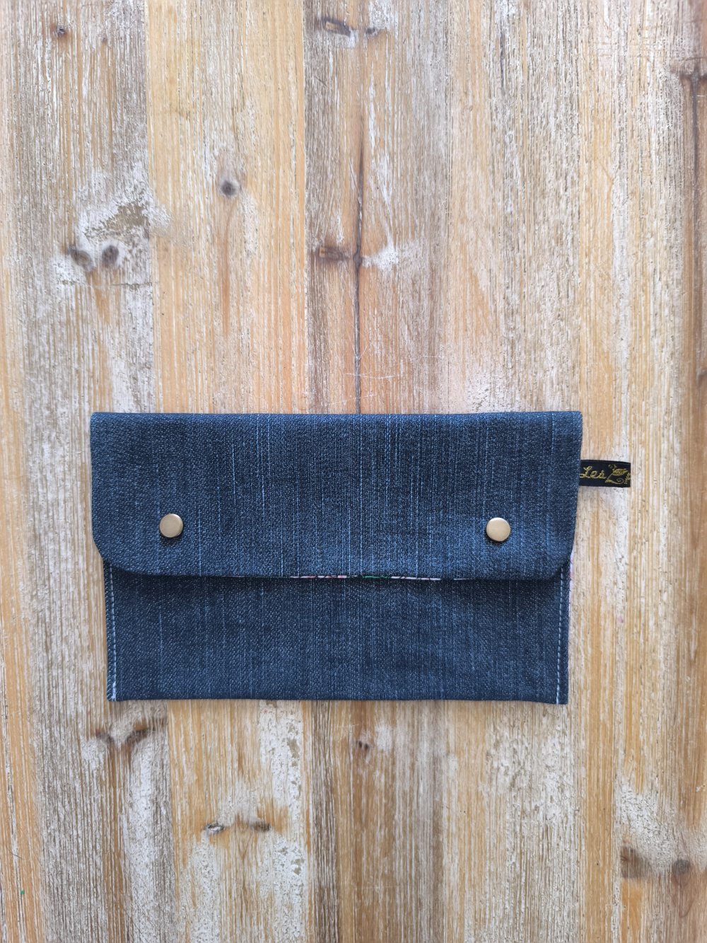 Confectionnée à partir de morceaux de jeans soigneusement sélectionnés et nettoyés par nos soins, Chaque trousse est doublée en coton et fermée avec des boutons en laiton.