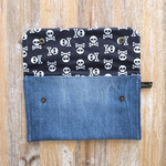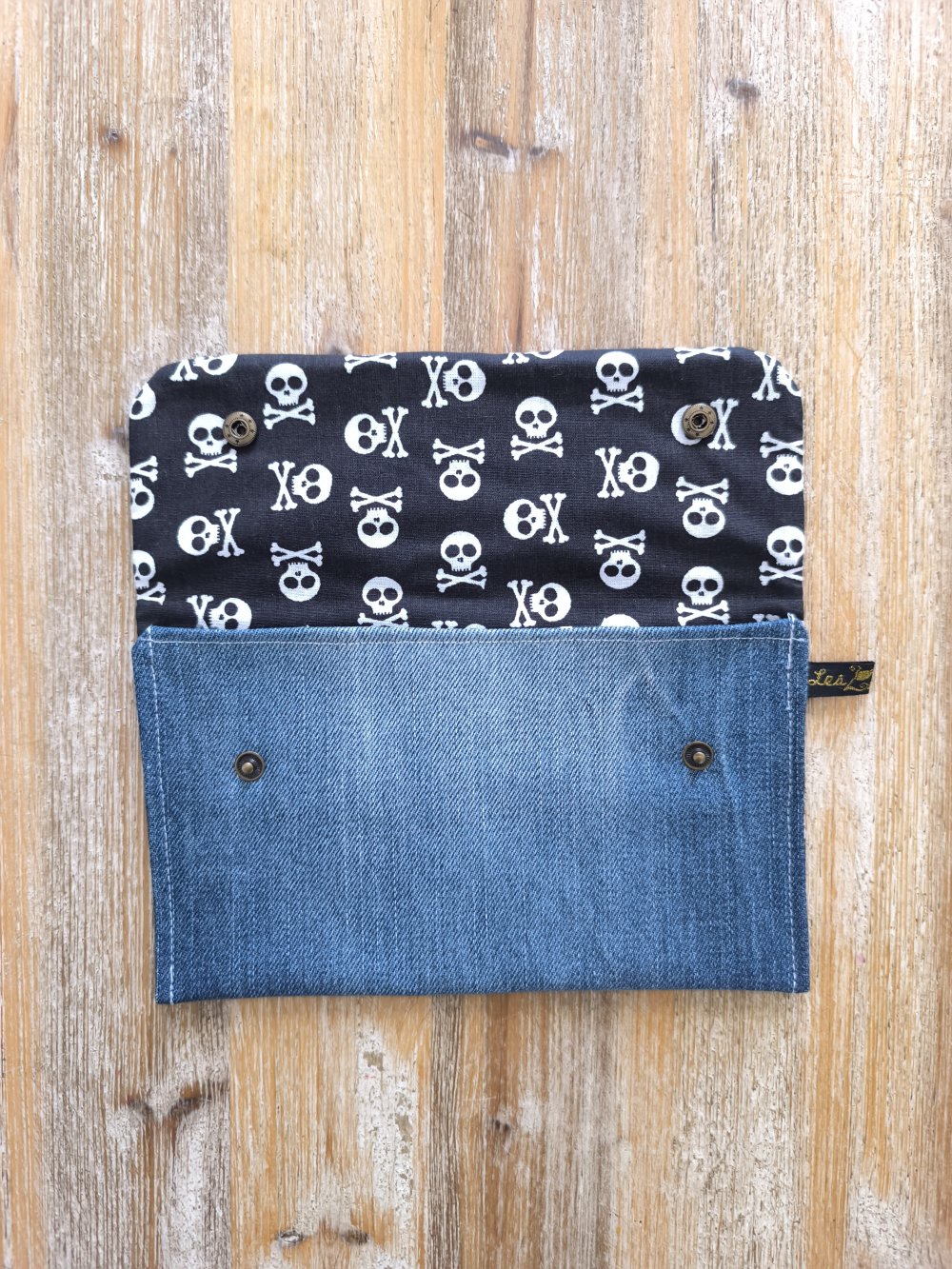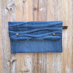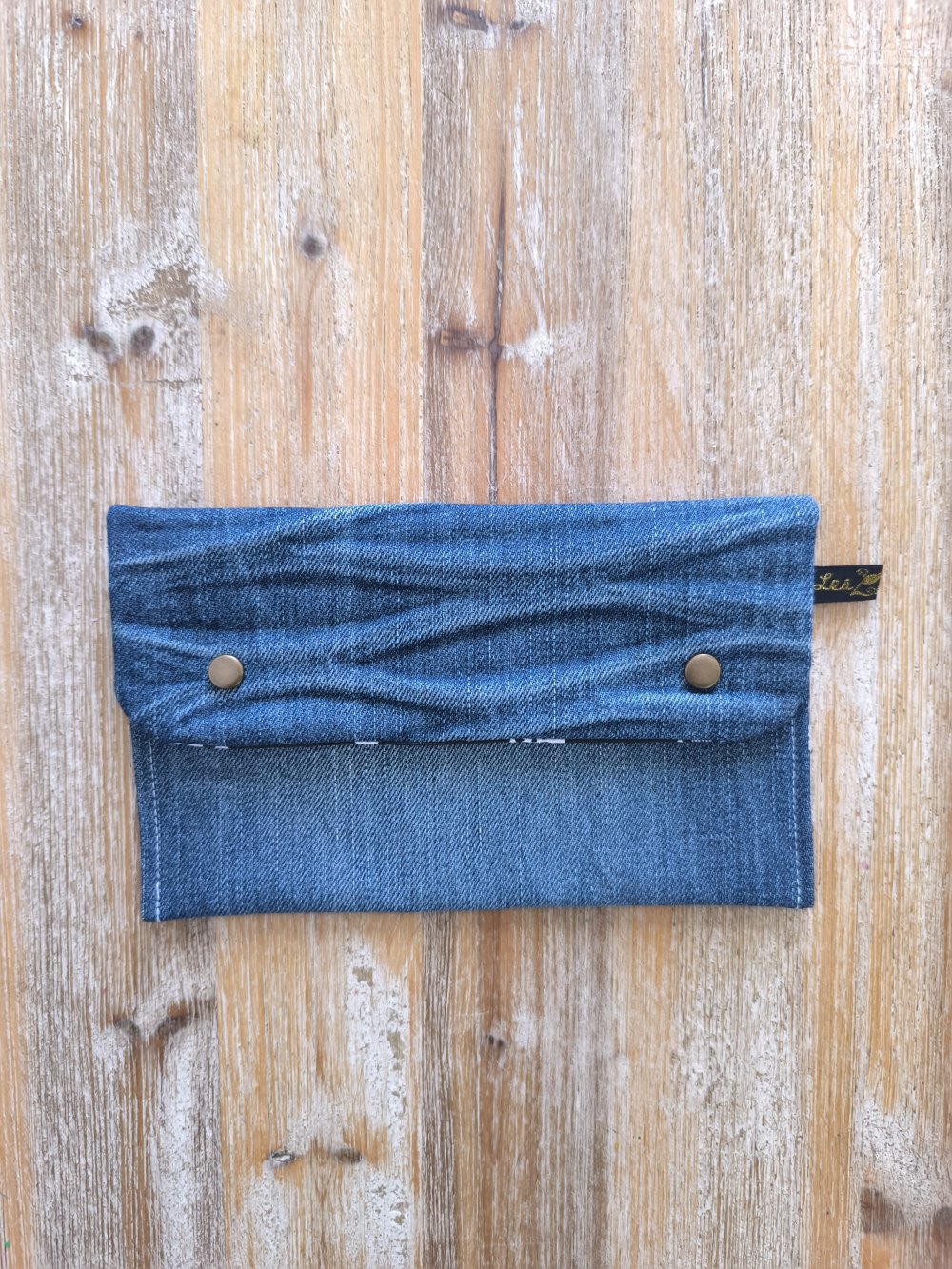 Confectionnée à partir de morceaux de jeans soigneusement sélectionnés et nettoyés par nos soins, Chaque trousse est doublée en coton et fermée avec des boutons en laiton.