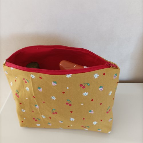 trousse en tissus , tissu moutarde à motifs cerises,fraises,intérieur rouge uni ,fermeture éclair rouge , thermocollant à l'intérieur , H/L / 16 / 25 cm, fond 11,5 cm.