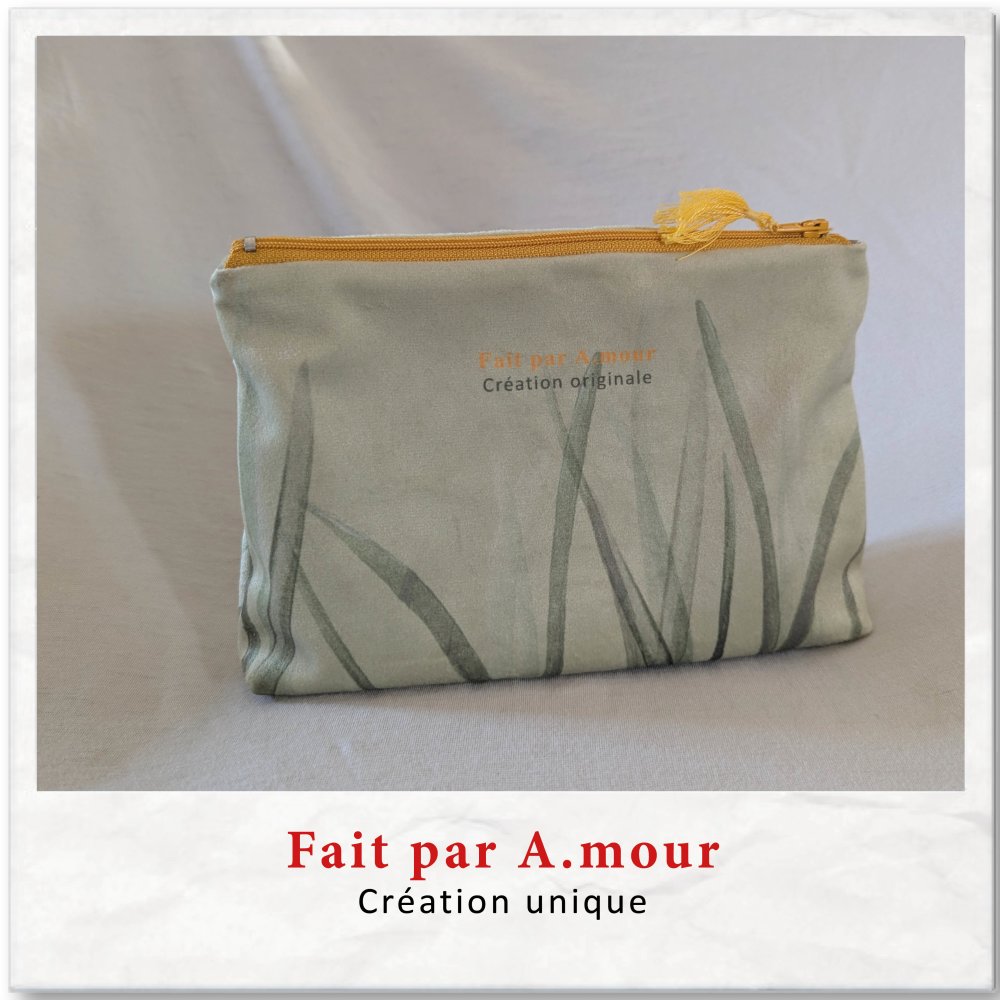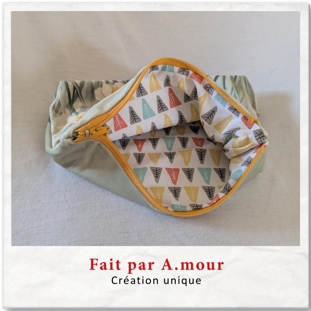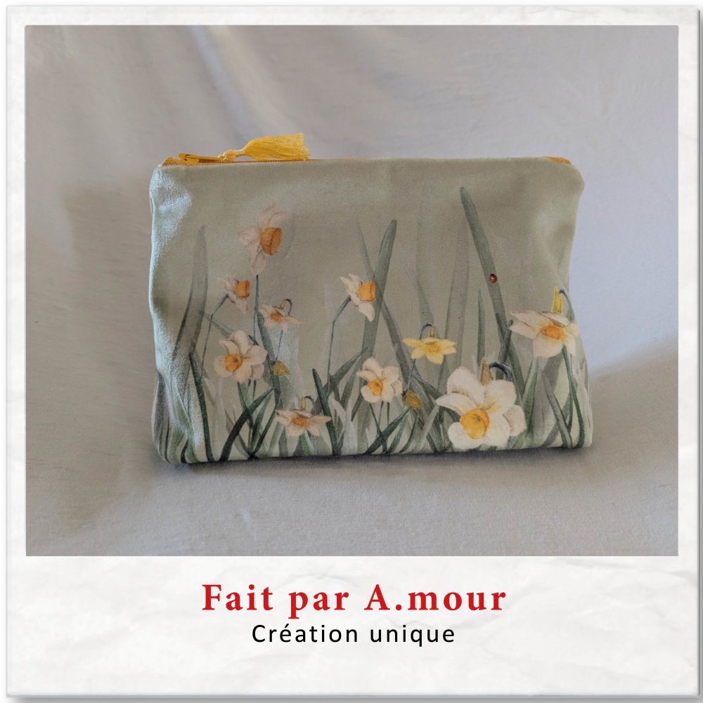 trousse en coton, , motif exclusif narcisse jaune dessiné par A.mour, fond du motif vert clair.
