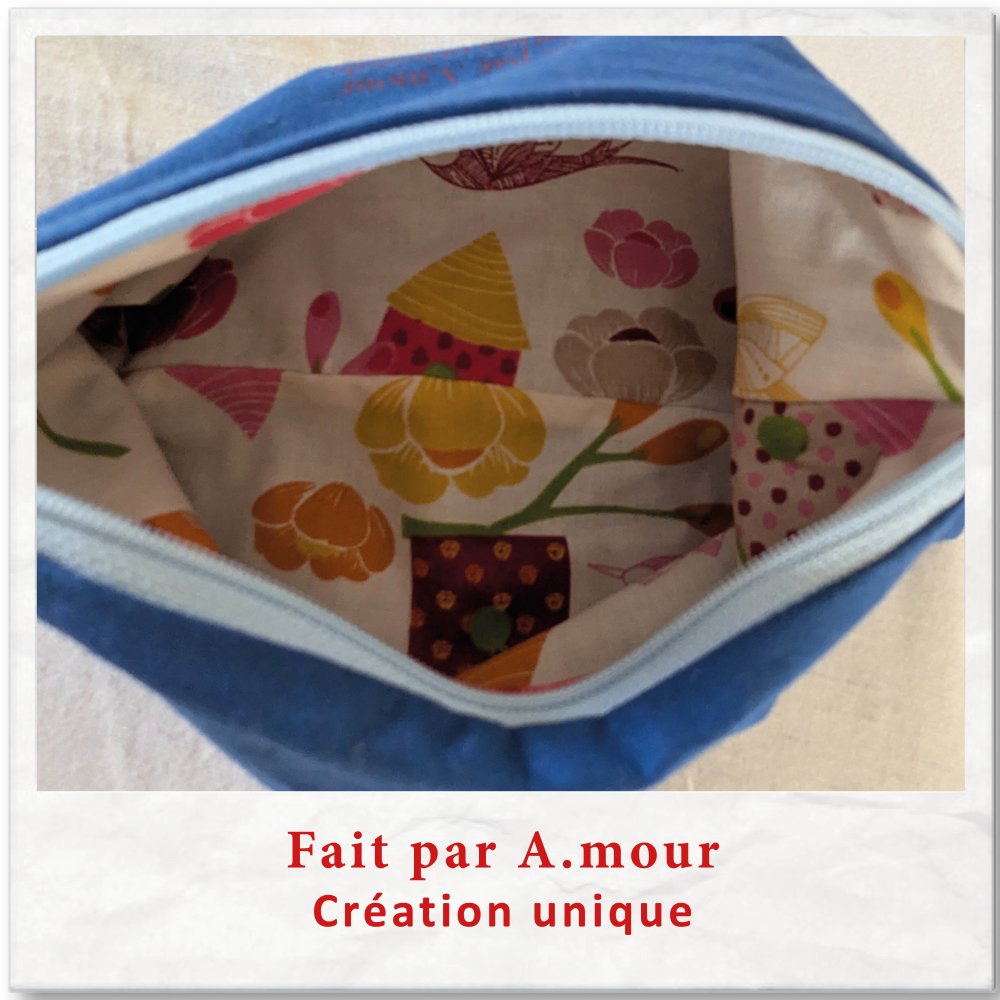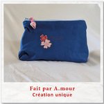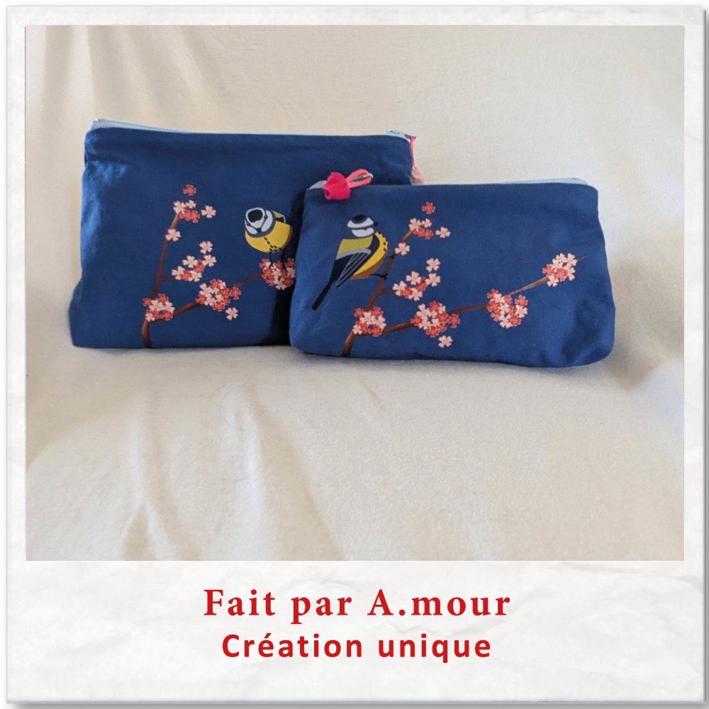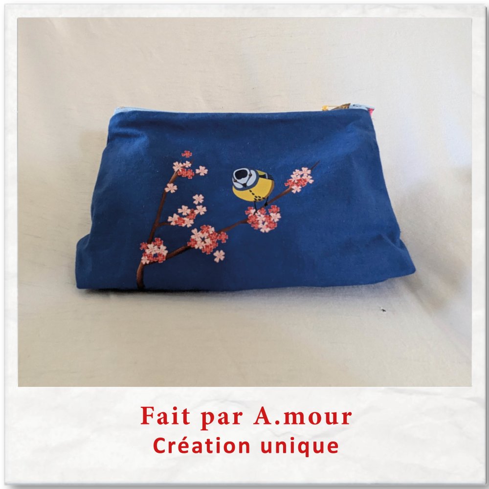 trousse en coton, , motif mésange bleue appliqué sur un coton bleu roi avec une branche de cerisier en fleurs