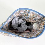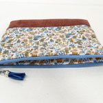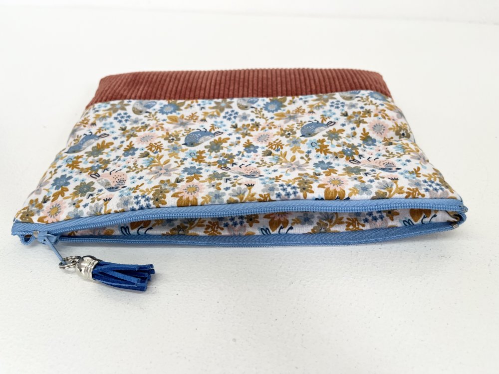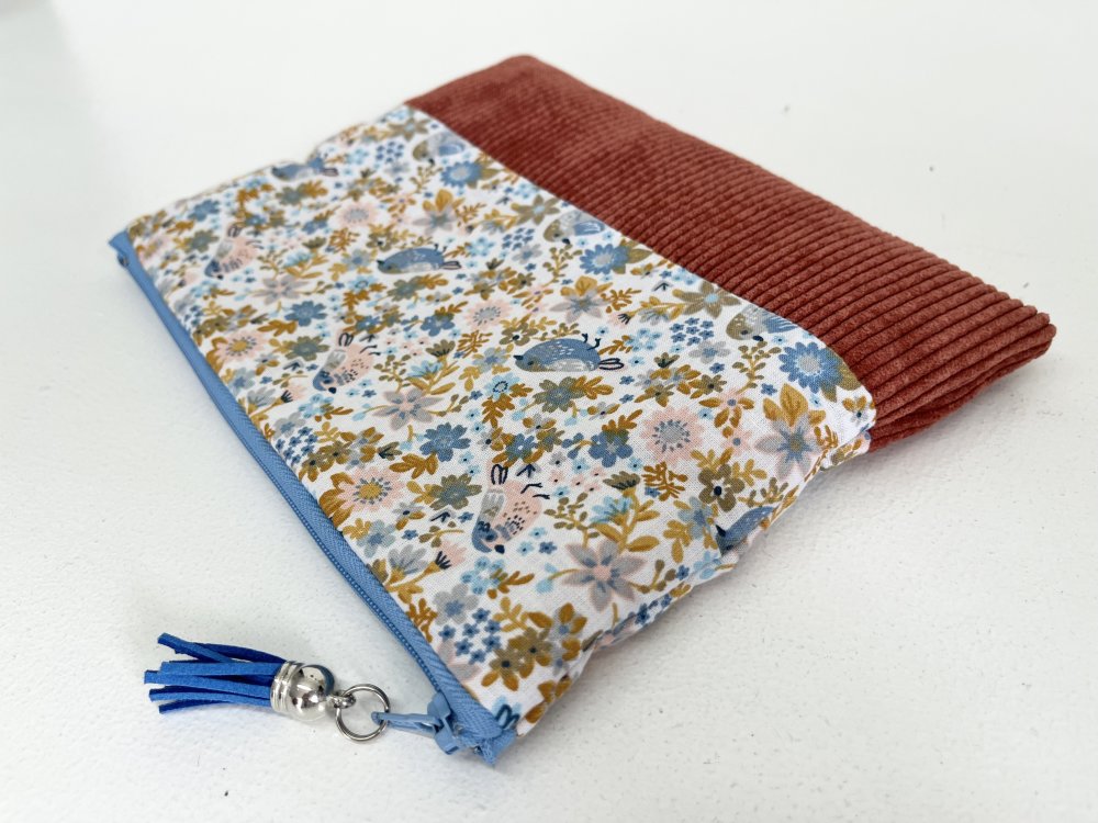 Une trousse poétique et chaleureuse, mêlant la douceur du velours couleur brique à un coton imprimé délicat, peuplé de fleurs et de petits oiseaux. Un duo de matières qui apporte à la fois élégance, originalité et un charme artisanal irrésistible.