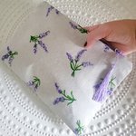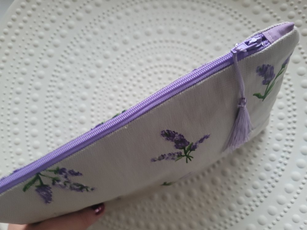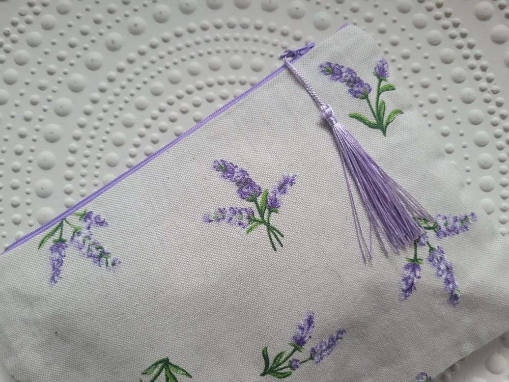 Trousse plate en tissu de coton imprimé lavande, doublée d'un tissu également en coton lilas.