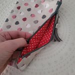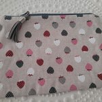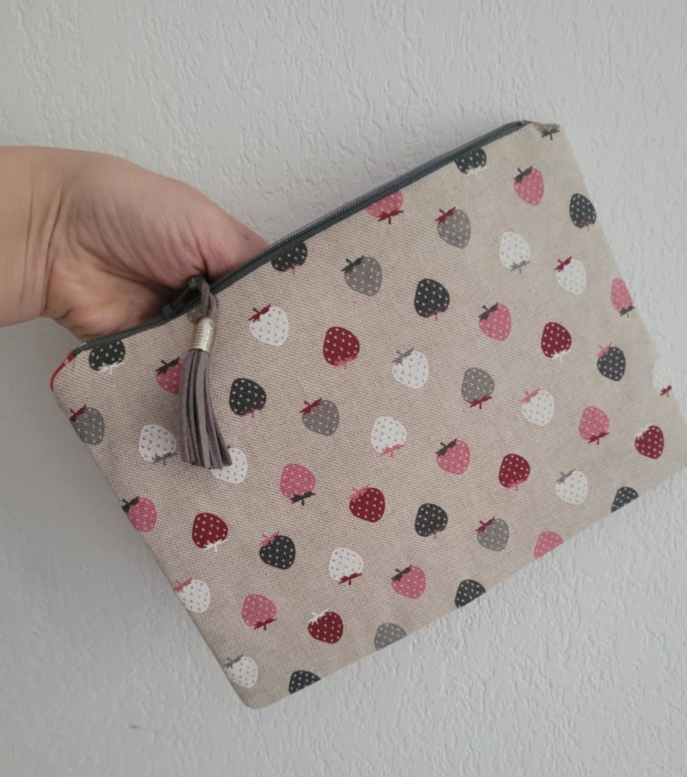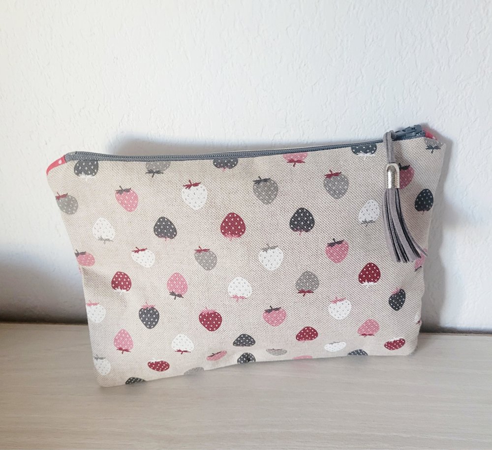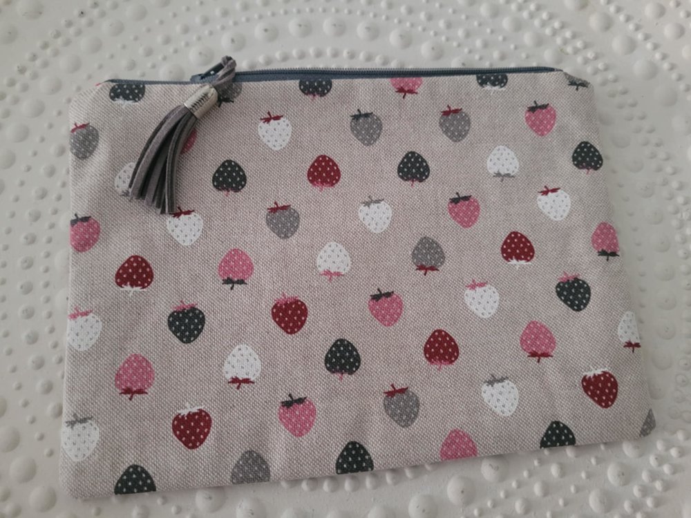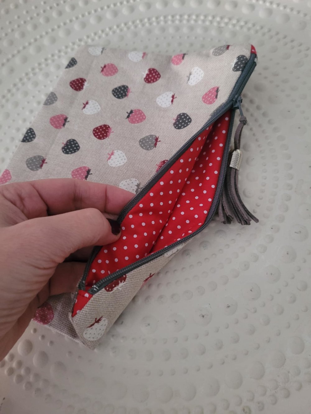 Trousse plate en tissu imprimé fraises, doublée d'un tissu rouge à petits pois blancs.