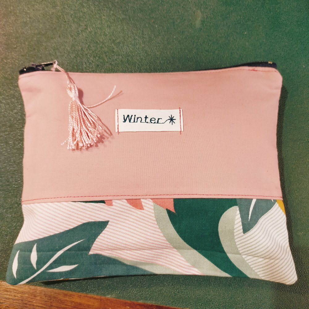 Elle est confectionnée à partir d'un assemblage de plusieurs tissus coordonnés. Cette pochette est entièrement doublée. Une petite étiquette "message" agrémente le devant de la trousse.