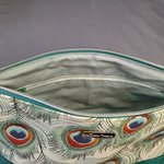 Son tissu imprimé met en valeur de magnifiques plumes de paon aux nuances de vert, turquoise, bleu et touches orangées.