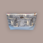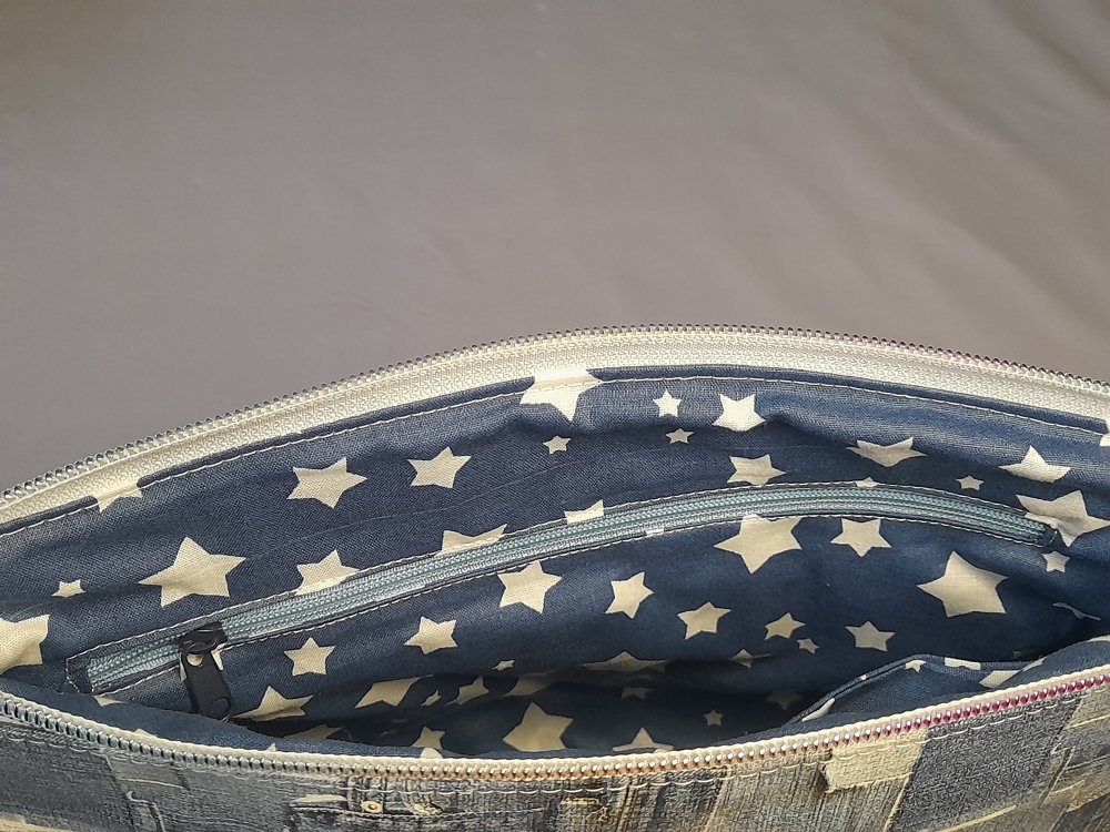 Une trousse moderne au look denim patchwork, parfaite pour organiser maquillage et essentiels avec style.