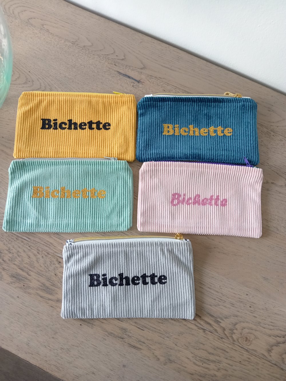 Trousse d'environ 10cm x 17cm, en velours côtelé.